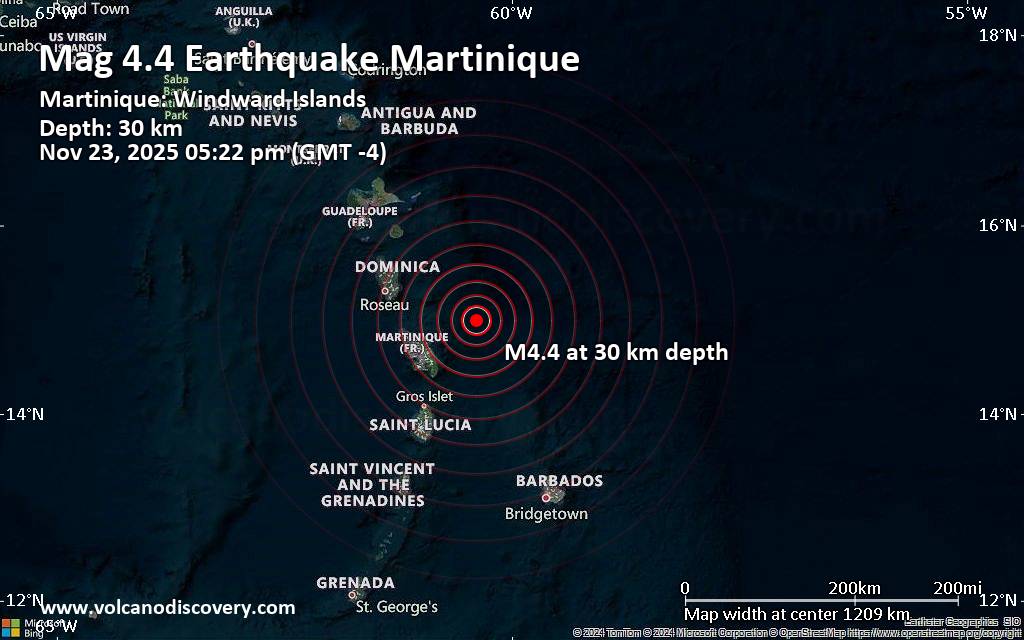 Magnitude 4.4 earthquake strikes near Fort-de-France, Martinique A magnitude 4.4 earthquake near Fort-de-France, Martinique, was reported only 23 minutes ago by the citizen-seismograph network of RaspberryShake, considered the main national agency that monitors seismic activity in this part of the world. The earthquake occurred at a shallow depth of 29.70 km beneath the epicenter in the afternoon on Sunday, November 23rd, 2025, at 5:22 pm local time. The exact magnitude, epicenter, and depth of the quake might be revised within the next few hours or minutes as seismologists review data and refine their calculations, or as other agencies issue their report. Towns or cities near the epicenter where the quake might have been felt as very weak shaking include La Trinite (pop. 15,000) located 68 km from the epicenter, Sainte-Marie (pop. 20,400) 69 km away, Le Robert (pop. 23,800) 69 km away, Le Francois (pop. 19,700) 69 km away, Le Lamentin (pop. 40,600) 78 km away, Ducos (pop. 17,400) 78 km away, and Fort-de-France (pop. 90,000) 85 km away. VolcanoDiscovery will automatically update magnitude and depth if these change and follow up if other significant news about the quake become available. If you’re in the area, please send us your experience through our reporting mechanism, either online or via our mobile app. This will help us provide more first-hand updates to anyone around the globe who wants to know more about this quake.
