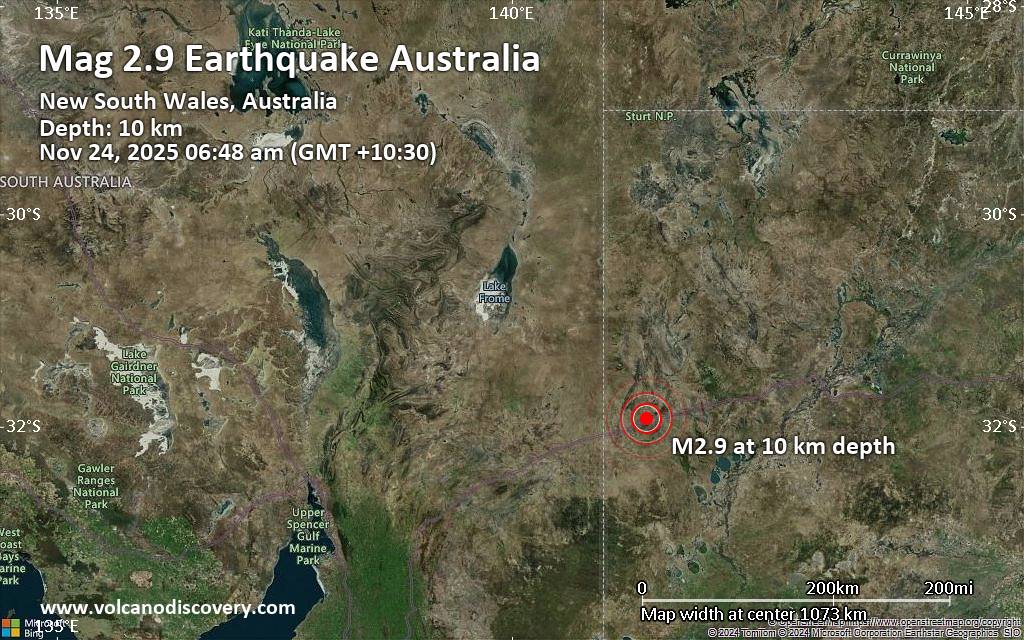 Small tremor of magnitude 2.9 just reported 4 miles northeast of Broken Hill, New South Wales, Australia An earthquake of magnitude 2.9 occurred early morning on Monday, November 24th, 2025, at 6:18 am local time near Broken Hill, Broken Hill Municipality, New South Wales, Australia, as reported by the European-Mediterranean Seismological Centre (EMSC). According to preliminary data, the quake was located at a shallow depth of 6.2 miles. Shallow earthquakes are felt more strongly than deeper ones as they are closer to the surface. The exact magnitude, epicenter, and depth of the quake might be revised within the next few hours or minutes as seismologists review data and refine their calculations, or as other agencies issue their report. Towns or cities near the epicenter where the quake might have been felt as very weak shaking include Broken Hill (pop. 18,000) located 4 miles from the epicenter. In Silverton (pop. 56, 15 miles away), and Kobern (pop. 42, 31 miles away), the quake was probably not felt.