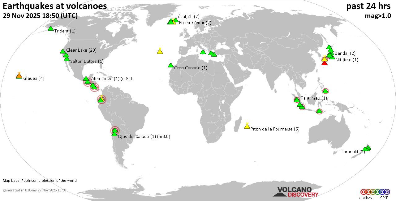 Volcano earthquake report for Saturday, 29 Nov 2025 World map showing volcanoes with shallow (less than 50 km) earthquakes within 20 km radius during the past 24 hours on 29 Nov 2025 Number in brackets indicate nr of quakes. Quakes detected near: Almolonga (1 quake mag 3.0), Aracar (1 quake mag 3.0), Arenal (1 quake mag 3.0), Aso (102 quakes between mag 0.1-2.1), Bandai (2 quakes between mag 0.4-1.3), Brennisteinsfjöll (3 quakes between mag 0.4-1.4) Campi Flegrei (Phlegrean Fields) (27 quakes between mag 0.1-1.9), Cerro Negro de Mayasquer (2 quakes between mag 3.3-3.3), Clear Lake (23 quakes between mag 0.1-1.6), Coso (2 quakes between mag 0.8-1.3), El Chichón (2 quakes between mag 2.0-2.3), Eldey (15 quakes between mag 0.5-2.5), Fremrinámar (2 quakes between mag 0.6-1.0), Gran Canaria (1 quake mag 1.6), Guagua Pichincha (1 quake mag 2.3), Hekla (2 quakes between mag 0.4-1.8), Hulubelu (3 quakes between mag 1.3-2.4), Kaba (1 quake mag 3.0), Katla (6 quakes between mag 0.4-1.4), Kilauea (7 quakes between mag 1.2-2.1), Kirishima (12 quakes between mag 0.1-2.5), Kolumbo (1 quake mag 1.6), Krísuvík (12 quakes between mag 0.2-2.6), Kuju (8 quakes between mag 0.2-1.9), Kusatsu-Shirane (1 quake mag 1.0), Leonard Range (1 quake mag 2.0), Lipari (1 quake mag 1.8), Ljósufjöll (7 quakes between mag 0.0-1.9), Loihi (3 quakes between mag 1.7-1.8), Maunaloa (1 quake mag 2.1), Nejapa-Miraflores (1 quake mag 3.0), Nii-jima (1 quake mag 1.5), Ojos del Salado (1 quake mag 3.0), Okataina (Tarawera) (1 quake mag 1.9), Osore-yama (1 quake mag 1.8), Piton de la Fournaise (6 quakes between mag 0.5-1.4), Poco Leok (1 quake mag 2.2), Ruapehu (4 quakes between mag 0.5-1.3), Salton Buttes (1 quake mag 1.9), Shikotsu (1 quake mag 1.7), Sorikmarapi (1 quake mag 2.5), Sousaki (2 quakes between mag 1.8-2.7), Suwanose-jima (1 quake mag 1.7), Talakmau (1 quake mag 2.3), Taranaki (2 quakes between mag 1.7-1.9), Taupo (2 quakes between mag 1.3-1.3), Terceira (2 quakes between mag 1.8-2.0), Trident (1 quake mag 1.0) (updated 16h50) Note: Earthquakes within 20 km from and at depths less than 50 km under active volcanoes are reported. The list is not complete because many volcanoes are not monitored and/or seismic data in high resolution is not available publicly.