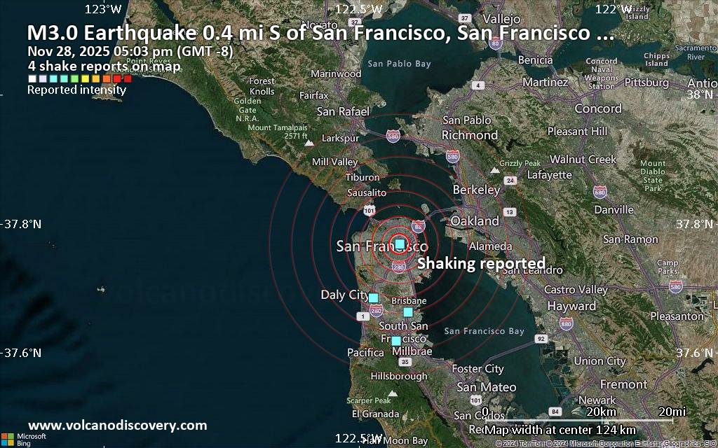 Earthquake data: Date & time: Nov 28, 2025 05:03 pm (GMT -8) local time (29 Nov 2025 01:03 GMT)Magnitude: unspecified Depth: unspecified Epicenter latitude / longitude: 37.77°N / 122.42°W  ( California, United States) Primary data source: VolcanoDiscoveryhttps://www.volcanodiscovery.com/earthquake/news/288152/Seismic-like-event-possible-earthquake-reported-few-minutes-ago-near-San-Francisco-California-USA.html