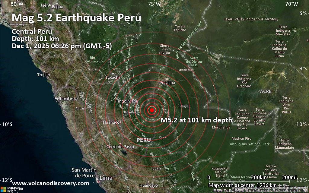 The quake hit at an intermediate depth of 101. km beneath the epicenter near Aguaytia, Padre Abad, Ucayali, Peru, early evening on Monday, December 1st, 2025, at 6:26 pm local time. The strength of the earthquake may have been tempered by its relative great depth below the surface, which makes it feel weaker in absolute terms. The exact magnitude, epicenter, and depth of the quake might be revised within the next few hours or minutes as seismologists review data and refine their calculations, or as other agencies issue their report.