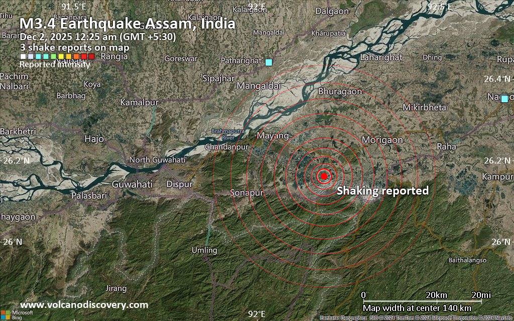 Earthquake data: Date & time: Dec 2, 2025 12:25 am (GMT +5:30) local time (1 Dec 2025 18:55 GMT)Magnitude: unspecified Depth: unspecified Epicenter latitude / longitude: 26.16°N / 92.18°E  ( Assam, India) Primary data source: VolcanoDiscoveryhttps://www.volcanodiscovery.com/earthquake/news/288370/Seismic-like-event-possible-earthquake-reported-few-minutes-ago-near-Nagaon-Assam-India.html