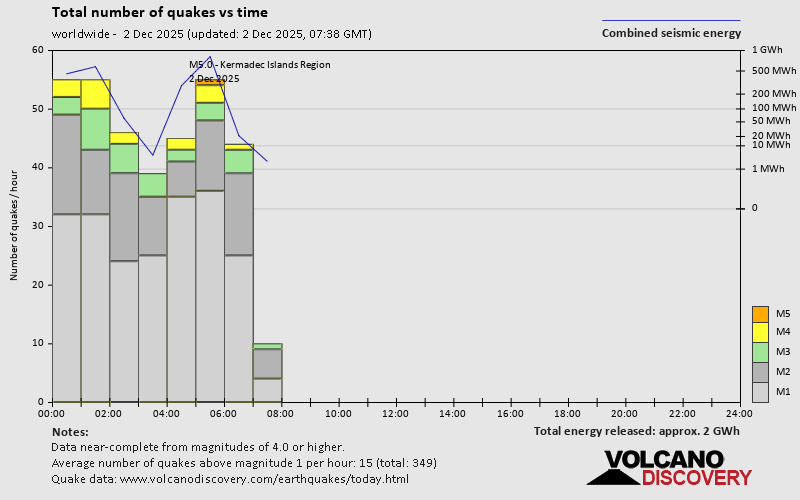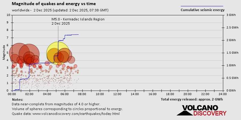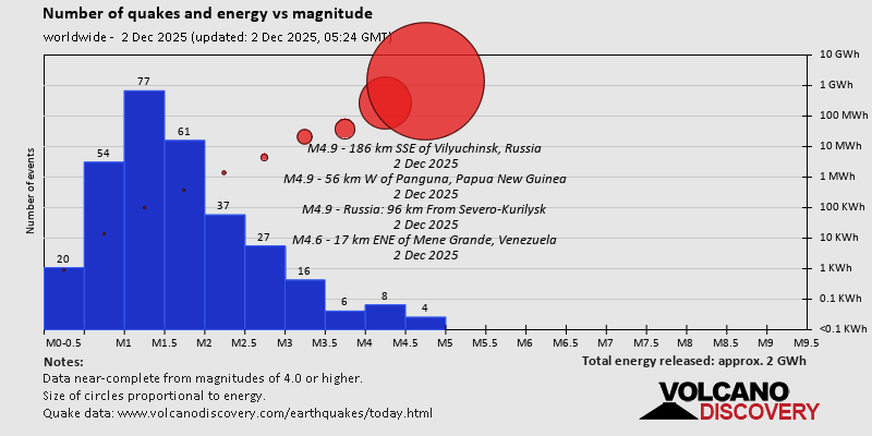 World Earthquake Report for Tuesday, 2 December 2025 Worldwide earthquakes above magnitude 3 during the past 24 hours on 2 Dec 2025 Summary: 5 quakes 5.0+, 44 quakes 4.0+, 129 quakes 3.0+, 316 quakes 2.0+ (494 total)This report is being updated every hour.Magnitude 5+: 5 earthquakes Magnitude 4+: 44 earthquakes Magnitude 3+: 129 earthquakes Magnitude 2+: 316 earthquakes No quakes of magnitude 6 or higher 10 largest earthquakes in the world (past 24 hours)Monday, Dec 1, 2025, at 11:08 am (GMT -12) - Monday, Dec 1, 2025, at 12:21 pm (GMT -10) - Tuesday, Dec 2, 2025, at 07:05 am (Guadalcanal time) - Monday, Dec 1, 2025, at 05:14 pm (GMT -12) - Monday, Dec 1, 2025, at 06:26 pm (Lima time) - Tuesday, Dec 2, 2025, at 08:12 am (GMT +11) - Tuesday, Dec 2, 2025, at 12:56 pm (Bougainville time) - Tuesday, Dec 2, 2025, at 01:25 am (Yangon time) - Tuesday, Dec 2, 2025, at 11:50 am (GMT +11) - Tuesday, Dec 2, 2025, at 02:07 am (GMT +12) - Earthquakes reported feltSunday, Nov 30, 2025, at 10:56 pm (GMT -8) - Monday, Dec 1, 2025, at 12:06 am (GMT -8) - Sunday, Nov 30, 2025, at 11:38 pm (GMT -8) - Tuesday, Dec 2, 2025, at 01:25 am (Yangon time) - Sunday, Nov 30, 2025, at 11:05 pm (GMT -8) - Sunday, Nov 30, 2025, at 10:59 pm (GMT -8) - Monday, Dec 1, 2025, at 02:39 am (GMT -6) - Monday, Dec 1, 2025, at 09:22 pm (GMT +5:30) - Monday, Dec 1, 2025, at 06:26 pm (Lima time) - Tuesday, Dec 2, 2025, at 12:48 am (Caracas time) - Monday, Dec 1, 2025, at 11:55 pm (Yakutsk time) - Monday, Dec 1, 2025, at 02:14 am (GMT -8) - Monday, Dec 1, 2025, at 01:38 pm (GMT +2) - Tuesday, Dec 2, 2025, at 06:11 am (GMT +8) - Tuesday, Dec 2, 2025, at 08:26 am (Yangon time) - Tuesday, Dec 2, 2025, at 06:07 am (Istanbul time) - Monday, Dec 1, 2025, at 01:35 am (GMT -6) - Monday, Dec 1, 2025, at 05:35 pm (GMT +2) - Earthquake stats  https://www.volcanodiscovery.com/earthquake/news/288404/World-Earthquake-Report-for-Tuesday-2-December-2025.html