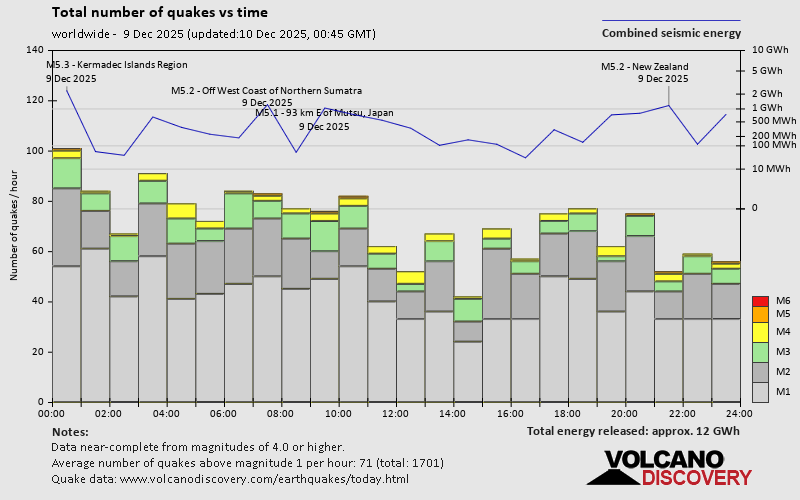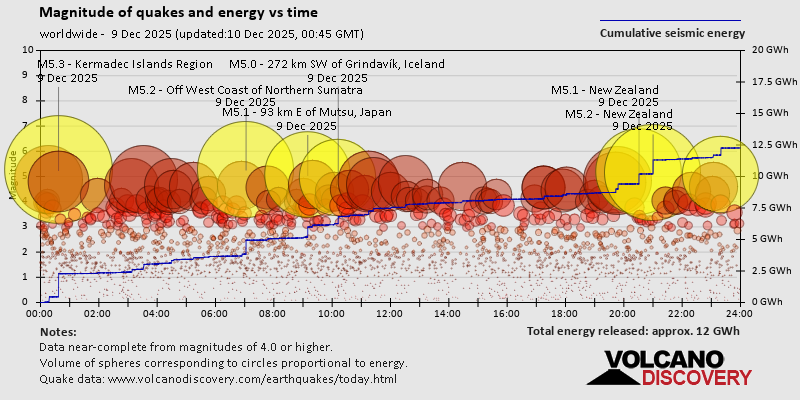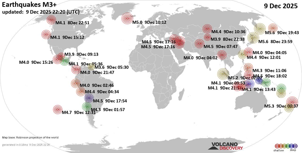 World Earthquake Report for Tuesday, 9 December 2025 Worldwide earthquakes above magnitude 3 during the past 24 hours on 9 Dec 2025 Summary: 8 quakes 5.0+, 57 quakes 4.0+, 180 quakes 3.0+, 454 quakes 2.0+ (699 total)This report is being updated every hour.Magnitude 5+: 8 earthquakes Magnitude 4+: 57 earthquakes Magnitude 3+: 180 earthquakes Magnitude 2+: 454 earthquakes No quakes of magnitude 6 or higher 10 largest earthquakes in the world (past 24 hours)Wednesday, Dec 10, 2025, at 06:43 am (GMT +11) - Tuesday, Dec 9, 2025, at 09:59 am (GMT +10) - Tuesday, Dec 9, 2025, at 12:37 pm (GMT +12) - Tuesday, Dec 9, 2025, at 09:00 am (GMT -12) - Tuesday, Dec 9, 2025, at 02:02 pm (Jakarta time) - Tuesday, Dec 9, 2025, at 06:09 pm (GMT +9) - Tuesday, Dec 9, 2025, at 08:31 am (GMT -12) - Tuesday, Dec 9, 2025, at 08:12 am (Reykjavik time) - Tuesday, Dec 9, 2025, at 01:33 pm (Port Moresby time) - Wednesday, Dec 10, 2025, at 02:48 am (Jakarta time) - Earthquakes reported feltTuesday, Dec 9, 2025, at 03:50 am (GMT +1) - Monday, Dec 8, 2025, at 02:55 pm (GMT -8) - Monday, Dec 8, 2025, at 09:39 pm (Chicago time) - Tuesday, Dec 9, 2025, at 07:05 am (GMT +1) - Tuesday, Dec 9, 2025, at 02:02 pm (Jakarta time) - Tuesday, Dec 9, 2025, at 05:36 pm (Barnaul time) - Tuesday, Dec 9, 2025, at 12:01 am (GMT +1) - Tuesday, Dec 9, 2025, at 10:18 pm (GMT +4) - Tuesday, Dec 9, 2025, at 04:11 pm (GMT +1) - Tuesday, Dec 9, 2025, at 12:01 am (GMT -8) - Tuesday, Dec 9, 2025, at 06:09 pm (GMT +9) - Wednesday, Dec 10, 2025, at 02:48 am (Jakarta time) - Monday, Dec 8, 2025, at 10:05 pm (GMT -8) - Tuesday, Dec 9, 2025, at 08:46 pm (Tehran time) - Tuesday, Dec 9, 2025, at 09:45 pm (Istanbul time) - Tuesday, Dec 9, 2025, at 04:11 pm (GMT +1) - Tuesday, Dec 9, 2025, at 09:59 am (GMT +10) - Tuesday, Dec 9, 2025, at 03:34 pm (Istanbul time) - Tuesday, Dec 9, 2025, at 05:34 pm (GMT +1) - Tuesday, Dec 9, 2025, at 02:46 am (Santiago time) - Monday, Dec 8, 2025, at 10:25 pm (GMT -6) - Wednesday, Dec 10, 2025, at 02:06 am (GMT +11) - Tuesday, Dec 9, 2025, at 04:01 am (GMT -5) - Tuesday, Dec 9, 2025, at 04:48 pm (Yangon time) - Monday, Dec 8, 2025, at 10:57 pm (Santiago time) - Monday, Dec 8, 2025, at 11:50 pm (GMT -3) - Earthquake stats  https://www.volcanodiscovery.com/earthquake/news/289038/World-Earthquake-Report-for-Tuesday-9-December-2025.html