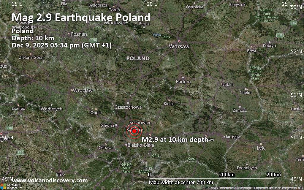 Small magnitude 2.9 earthquake 4 km northwest of Chrzanow, Poland The European-Mediterranean Seismological Centre (EMSC) reported a magnitude 2.9 quake in Poland near Chrzanow, Chrzanów County, Lesser Poland Voivodeship, only 4 minutes ago. The earthquake hit in the afternoon on Tuesday, December 9th, 2025, at 5:34 pm local time at a shallow depth of 10. km. The exact magnitude, epicenter, and depth of the quake might be revised within the next few hours or minutes as seismologists review data and refine their calculations, or as other agencies issue their report. Towns or cities near the epicenter where the quake might have been felt as very weak shaking include Chrzanow (pop. 40,000) located 4 km from the epicenter, Libiaz (pop. 17,800) 6 km away, Jaworzno (pop. 96,500) 8 km away, Trzebinia (pop. 18,800) 9 km away, Myslowice (pop. 72,100) 14 km away, and Oswiecim (pop. 34,200) 16 km away. In Dabrowa Gornicza (pop. 117,000, 23 km away), Katowice (pop. 317,300, 26 km away), and Krakow (pop. 755,100, 43 km away), the quake was probably not felt.