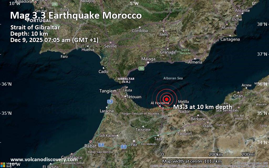 Small tremor of magnitude 3.3 just reported 36 km northeast of Al Hoceima, Morocco A shallow magnitude 3.3 earthquake was reported in the morning near Al Hoceima, Al-Hoceima, Tanger-Tetouan-Al Hoceima, Morocco. According to the European-Mediterranean Seismological Centre (EMSC), the quake hit on Tuesday, December 9th, 2025, at 7:05 am local time at a shallow depth of 10. km. Shallow earthquakes are felt more strongly than deeper ones as they are closer to the surface. The exact magnitude, epicenter, and depth of the quake might be revised within the next few hours or minutes as seismologists review data and refine their calculations, or as other agencies issue their report. A second report was later issued by Spain's Instituto Geográfico Nacional (IGN), which listed it as a magnitude 3.3 earthquake as well. A third agency, the citizen-seismograph network of RaspberryShake, reported the same quake at magnitude 3.3. Towns or cities near the epicenter where the quake might have been felt as very weak shaking include Al Hoceima (pop. 395,600) located 36 km from the epicenter, Tirhanimine (pop. 55,800) 38 km away, and Imzouren (pop. 40,000) 41 km away. In Bni Bouayach (pop. 20,000, 44 km away), Ben Taieb (pop. 15,600, 51 km away), Beni Enzar (pop. 61,800, 70 km away), and Nador (pop. 176,600, 74 km away), the quake was probably not felt.