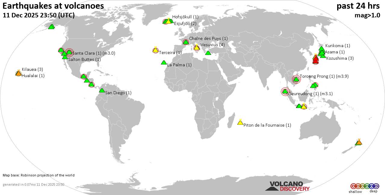 Volcano earthquake report for Thursday, 11 Dec 2025 World map showing volcanoes with shallow (less than 50 km) earthquakes within 20 km radius during the past 24 hours on 11 Dec 2025 Number in brackets indicate nr of quakes. Quakes detected near: Akuseki-jima (5 quakes between mag 0.9-2.2), Apaneca Range (1 quake mag 1.8), Asama (1 quake mag 2.5), Aso (18 quakes between mag 0.2-1.6), Augustine (1 quake mag 1.7), Baluran (1 quake mag 2.5) Bandai (1 quake mag 1.1), Cabalian (1 quake mag 2.3), Campi Flegrei (Phlegrean Fields) (10 quakes between mag 0.1-2.0), Chaîne des Puys (1 quake mag 2.0), Clear Lake (21 quakes between mag 0.2-2.0), Coso (3 quakes between mag 0.1-1.2), Cuernos de Negros (1 quake mag 3.0), Dieng (1 quake mag 2.3), El Chichón (5 quakes between mag 2.1-3.4), Eldey (1 quake mag 2.2), Esjufjöll (2 quakes between mag 1.3-1.5), Fourpeaked (4 quakes between mag 1.7-2.0), Geureudong (1 quake mag 3.1), Hiuchi (3 quakes between mag 0.5-1.2), Hofsjökull (1 quake mag 2.0), Hrómundartindur (1 quake mag 1.4), Hualalai (1 quake mag 2.1), Ijen (3 quakes between mag 2.2-3.0), Katla (1 quake mag 1.2), Kilauea (3 quakes between mag 1.4-1.8), Kirishima (2 quakes between mag 0.6-1.0), Kolumbo (1 quake mag 1.6), Kozushima (3 quakes between mag 1.4-2.0), Kuju (6 quakes between mag 0.2-1.7), Kurikoma (1 quake mag 1.4), La Palma (1 quake mag 1.4), Nantai (8 quakes between mag 0.1-1.8), Okataina (Tarawera) (1 quake mag 1.9), Ontake-san (3 quakes between mag 0.2-1.0), Osore-yama (1 quake mag 1.0), Piton de la Fournaise (1 quake mag 1.5), Salton Buttes (1 quake mag 1.2), San Diego (1 quake mag 1.5), Santa Clara (1 quake mag 3.0), Sundoro (1 quake mag 2.4), Suwanose-jima (1 quake mag 1.7), Takahara (1 quake mag 1.0), Tenorio (2 quakes between mag 2.3-2.4), Terceira (1 quake mag 2.0), Toroeng Prong (1 quake mag 3.9), Vesuvius (4 quakes between mag 0.1-1.4), White Island (1 quake mag 2.0) (updated 23h50) Note: Earthquakes within 20 km from and at depths less than 50 km under active volcanoes are reported. The list is not complete because many volcanoes are not monitored and/or seismic data in high resolution is not available publicly.