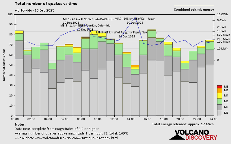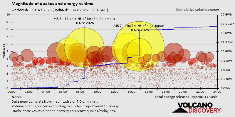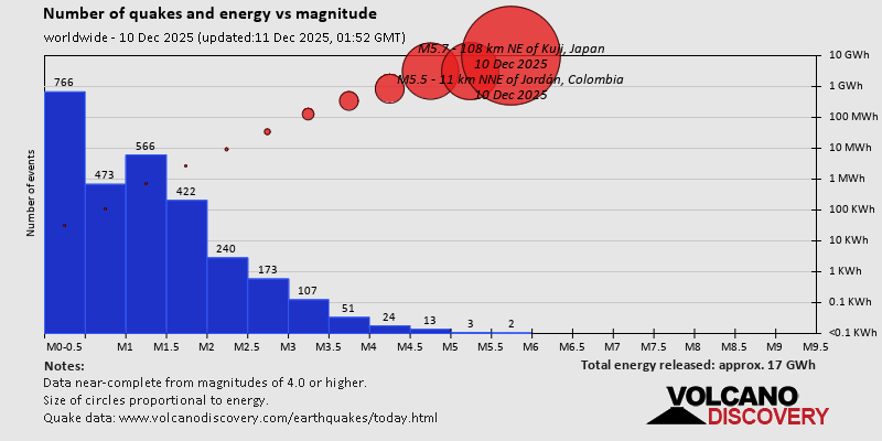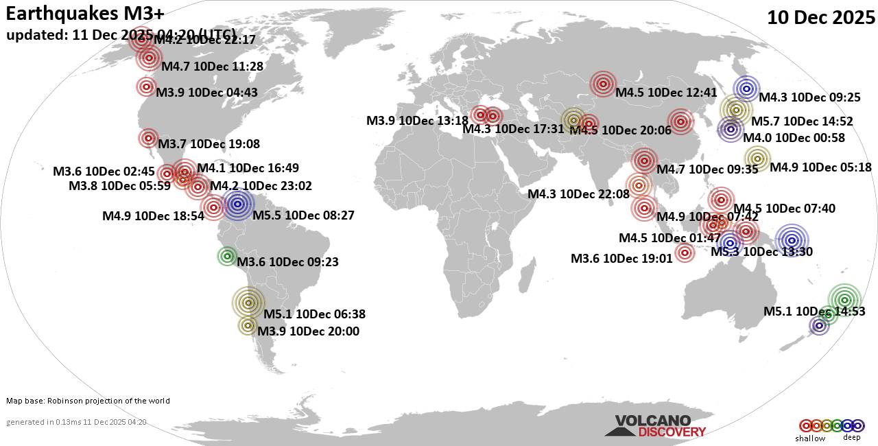 World Earthquake Report for Wednesday, 10 December 2025 Worldwide earthquakes above magnitude 3 during the past 24 hours on 11 Dec 2025 Summary: 5 quakes 5.0+, 38 quakes 4.0+, 189 quakes 3.0+, 419 quakes 2.0+ (651 total)Magnitude 5+: 5 earthquakes Magnitude 4+: 38 earthquakes Magnitude 3+: 189 earthquakes Magnitude 2+: 419 earthquakes No quakes of magnitude 6 or higher 10 largest earthquakes in the world (10 Dec 2025)Thursday, Dec 11, 2025, at 12:52 am (GMT +10) - Wednesday, Dec 10, 2025, at 03:27 am (Bogota time) - Thursday, Dec 11, 2025, at 12:30 am (GMT +11) - Thursday, Dec 11, 2025, at 03:53 am (GMT +13) - Wednesday, Dec 10, 2025, at 03:38 am (Santiago time) - Wednesday, Dec 10, 2025, at 01:54 pm (GMT -5) - Wednesday, Dec 10, 2025, at 02:42 pm (GMT +7) - Wednesday, Dec 10, 2025, at 02:18 pm (GMT +9) - Wednesday, Dec 10, 2025, at 11:01 pm (GMT +9) - Wednesday, Dec 10, 2025, at 03:23 pm (GMT +9) - Earthquakes reported feltWednesday, Dec 10, 2025, at 03:27 am (Bogota time) - Thursday, Dec 11, 2025, at 12:44 am (Berlin time) - Thursday, Dec 11, 2025, at 12:38 am (Prague time) - Wednesday, Dec 10, 2025, at 03:38 am (Santiago time) - Wednesday, Dec 10, 2025, at 10:58 am (Prague time) - Thursday, Dec 11, 2025, at 12:52 am (GMT +10) - Wednesday, Dec 10, 2025, at 05:14 am (Paris time) - Wednesday, Dec 10, 2025, at 04:05 pm (Yangon time) - Wednesday, Dec 10, 2025, at 01:18 am (Prague time) - Wednesday, Dec 10, 2025, at 08:43 pm (Prague time) - Tuesday, Dec 9, 2025, at 11:41 pm (GMT -5) - Thursday, Dec 11, 2025, at 12:39 am (Prague time) - Wednesday, Dec 10, 2025, at 07:55 am (Athens time) - Wednesday, Dec 10, 2025, at 11:14 pm (Melbourne time) - Wednesday, Dec 10, 2025, at 04:23 am (GMT -5) - Wednesday, Dec 10, 2025, at 09:24 am (GMT +2) - Wednesday, Dec 10, 2025, at 03:40 pm (Manila time) - Wednesday, Dec 10, 2025, at 09:19 am (Athens time) - Thursday, Dec 11, 2025, at 02:50 am (GMT +6) - Thursday, Dec 11, 2025, at 02:25 am (Kolkata time) - Wednesday, Dec 10, 2025, at 04:18 pm (Istanbul time) - Wednesday, Dec 10, 2025, at 01:26 pm (Prague time) - Wednesday, Dec 10, 2025, at 11:01 pm (GMT +9) - Wednesday, Dec 10, 2025, at 02:05 pm (Istanbul time) - Wednesday, Dec 10, 2025, at 04:18 am (Guatemala time) - Wednesday, Dec 10, 2025, at 01:57 pm (Manila time) - Thursday, Dec 11, 2025, at 06:12 am (Makassar time) - Wednesday, Dec 10, 2025, at 06:35 am (Prague time) - Wednesday, Dec 10, 2025, at 06:27 pm (Prague time) - Wednesday, Dec 10, 2025, at 12:11 am (Anchorage time) - Tuesday, Dec 9, 2025, at 07:33 pm (GMT -5) - Earthquake stats  https://www.volcanodiscovery.com/earthquake/news/289097/World-Earthquake-Report-for-Wednesday-10-December-2025.html