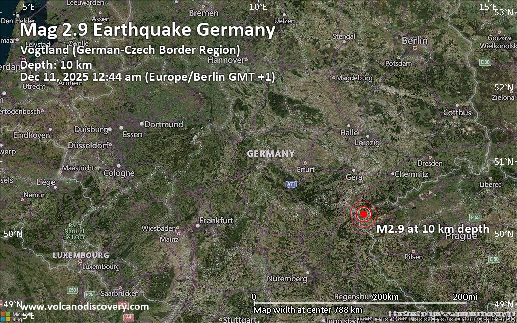 Earthquake data: Date & time: Dec 11, 2025 12:44 am (Berlin time) local time (10 Dec 2025 23:44 GMT)Magnitude: 2.9 Depth: 10.00 km Epicenter latitude / longitude: 50.27°N / 12.29°E  ( Vogtlandkreis, Saxony, Germany) Primary data source: GFZhttps://www.volcanodiscovery.com/earthquake/news/289149/Magnitude-29-earthquake-strikes-near-Plauen-Saxony-Germany.html