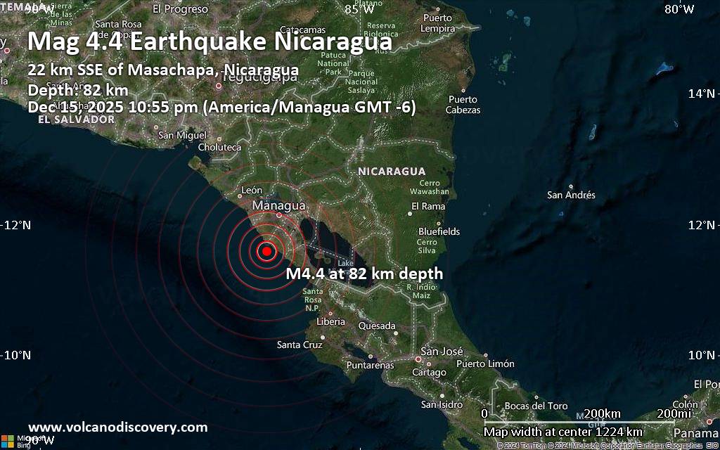 Earthquake data: Date & time: Dec 15, 2025 10:55 pm (Managua time) local time (16 Dec 2025 04:55 GMT)Magnitude: 4.4 Depth: 81.62 km Epicenter latitude / longitude: 11.59°N / 86.46°W  ( Departamento de Managua, Nicaragua) Primary data source: USGShttps://www.volcanodiscovery.com/earthquake/news/289531/Magnitude-44-earthquake-strikes-near-Managua-Departamento-de-Managua-Nicaragua.html