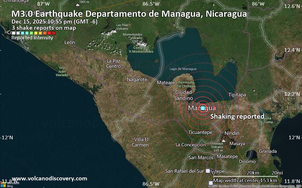 Earthquake data: Date & time: Dec 15, 2025 10:55 pm (GMT -6) local time (16 Dec 2025 04:55 GMT)Magnitude: unspecified Depth: unspecified Epicenter latitude / longitude: 12.14°N / 86.26°W  ( Departamento de Managua, Nicaragua) Primary data source: VolcanoDiscoveryhttps://www.volcanodiscovery.com/earthquake/news/289529/Seismic-like-event-possible-earthquake-reported-few-minutes-ago-near-Managua-Managua-Department-Nica.html