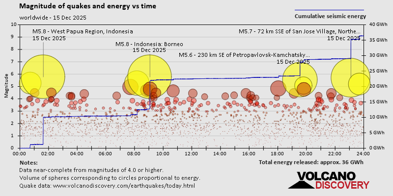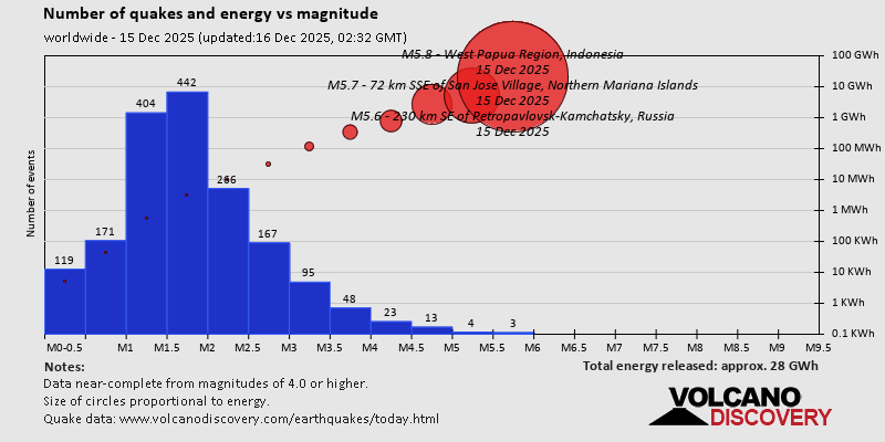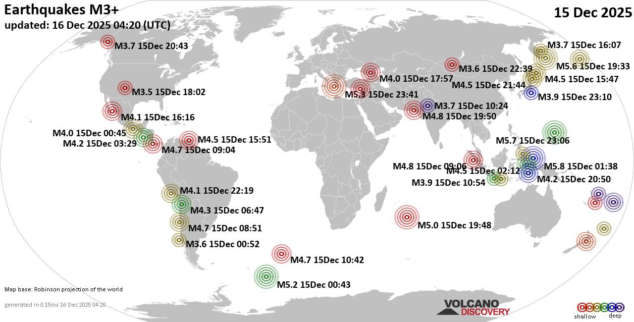 World Earthquake Report for Monday, 15 December 2025 Worldwide earthquakes above magnitude 3 during the past 24 hours on 16 Dec 2025 Summary: 7 quakes 5.0+, 36 quakes 4.0+, 162 quakes 3.0+, 438 quakes 2.0+ (643 total)Magnitude 5+: 7 earthquakes Magnitude 4+: 36 earthquakes Magnitude 3+: 162 earthquakes Magnitude 2+: 438 earthquakes No quakes of magnitude 6 or higher 10 largest earthquakes in the world (15 Dec 2025)Monday, Dec 15, 2025, at 10:38 am (GMT +9) - Tuesday, Dec 16, 2025, at 09:06 am (GMT +10) - Tuesday, Dec 16, 2025, at 06:33 am (GMT +11) - Tuesday, Dec 16, 2025, at 01:41 am (GMT +2) - Monday, Dec 15, 2025, at 08:11 pm (GMT +12) - Sunday, Dec 14, 2025, at 10:43 pm (GMT -2) - Monday, Dec 15, 2025, at 11:48 pm (GMT +4) - Monday, Dec 15, 2025, at 08:03 am (GMT -10) - Monday, Dec 15, 2025, at 07:43 pm (Fiji time) - Monday, Dec 15, 2025, at 04:06 pm (GMT +7) - Earthquakes reported feltMonday, Dec 15, 2025, at 11:32 pm (GMT +13) - Monday, Dec 15, 2025, at 09:39 am (Lisbon time) - Monday, Dec 15, 2025, at 07:20 am (Belgrade time) - Tuesday, Dec 16, 2025, at 12:50 am (Karachi time) - Tuesday, Dec 16, 2025, at 09:06 am (GMT +10) - Sunday, Dec 14, 2025, at 10:46 pm (GMT -8) - Tuesday, Dec 16, 2025, at 01:41 am (GMT +2) - Sunday, Dec 14, 2025, at 04:04 pm (Los Angeles time) - Monday, Dec 15, 2025, at 12:20 pm (Istanbul time) - Tuesday, Dec 16, 2025, at 01:05 am (Auckland time) - Tuesday, Dec 16, 2025, at 06:33 am (GMT +11) - Monday, Dec 15, 2025, at 06:22 pm (GMT +2) - Monday, Dec 15, 2025, at 08:29 am (GMT -8) - Monday, Dec 15, 2025, at 05:51 am (Santiago time) - Monday, Dec 15, 2025, at 08:57 pm (Moscow time) - Sunday, Dec 14, 2025, at 10:47 pm (GMT -8) - Monday, Dec 15, 2025, at 06:29 pm (GMT +2) - Monday, Dec 15, 2025, at 03:04 am (Costa Rica time) - Monday, Dec 15, 2025, at 05:54 pm (GMT +7) - Monday, Dec 15, 2025, at 10:11 am (GMT +1) - Sunday, Dec 14, 2025, at 04:07 pm (GMT -8) - Monday, Dec 15, 2025, at 10:21 pm (Bucharest time) - Monday, Dec 15, 2025, at 11:30 pm (GMT +13) - Sunday, Dec 14, 2025, at 11:16 pm (GMT -6) - Monday, Dec 15, 2025, at 10:47 am (GMT +1) - Monday, Dec 15, 2025, at 12:25 pm (Azores time) - Earthquake stats  https://www.volcanodiscovery.com/earthquake/news/289452/World-Earthquake-Report-for-Monday-15-December-2025.html