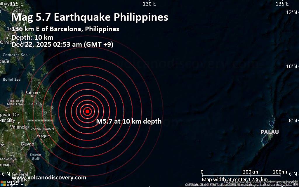 Significant 5.7 quake hits near Barcelona, Surigao del Sur, Caraga, Philippines A shallow magnitude 5.7 earthquake was reported early morning near Barcelona, Surigao del Sur, Caraga, Philippines. According to the United States Geological Survey, the quake hit on Monday, December 22nd, 2025, at 2:53 am local time at a shallow depth of 10. km. Shallow earthquakes are felt more strongly than deeper ones as they are closer to the surface. The exact magnitude, epicenter, and depth of the quake might be revised within the next few hours or minutes as seismologists review data and refine their calculations, or as other agencies issue their report. A second report was later issued by The Incorporated Research Institutions for Seismology (IRIS), which listed it as a magnitude 5.7 earthquake as well. Other agencies reporting the same quake include the European-Mediterranean Seismological Centre (EMSC) at magnitude 5.7, Italy's National Institute of Geophysics and Volcanology (INGV) at magnitude 5.8, France's Réseau National de Surveillance Sismique (RéNaSS) at magnitude 5.6, Indonesia's Meteorology, Climatology, and Geophysical Agency at magnitude 5.6, the citizen-seismograph network of RaspberryShake at magnitude 5.7, the Philippine Institute of Volcanology and Seismology (PHIVOLCS) at magnitude 5.7, and the German Research Centre for Geosciences (GFZ) at magnitude 5.7. Generally quakes of this magnitude are recorded by more than one agency and the results can vary, with subsequent reports that come in after the first one often showing more accuracy. Based on the preliminary seismic data, the quake should not have caused any significant damage, but was probably felt by many people as light vibration in the area of the epicenter. Weak shaking might have been felt in Barcelona (pop. 3,500) located 136 km from the epicenter. VolcanoDiscovery will automatically update magnitude and depth if these change and follow up if other significant news about the quake become available. If you’re in the area, please send us your experience through our reporting mechanism, either online or via our mobile app. This will help us provide more first-hand updates to anyone around the globe who wants to know more about this quake.
