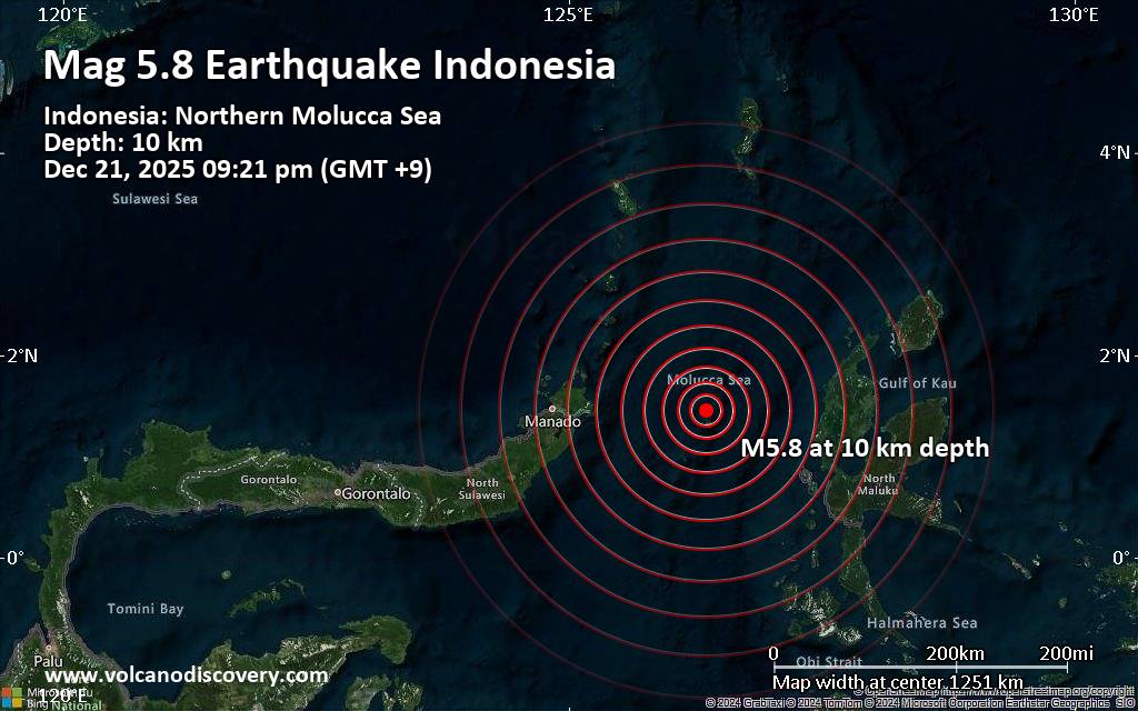 Earthquake data: Date & time: Dec 21, 2025 09:21 pm (Jayapura time) local time (21 Dec 2025 12:21 GMT)Magnitude: 5.8 Depth: 10.00 km Epicenter latitude / longitude: 1.46°N / 126.36°E  (Kota Ternate, North Maluku, Indonesia) Primary data source: BMKGhttps://www.volcanodiscovery.com/earthquake/news/290033/Significant-magnitude-58-earthquake-136-km-northwest-of-Ternate-Indonesia.html