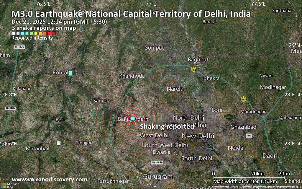 Earthquake data: Date & time: Dec 21, 2025 12:14 pm (GMT +5:30) local time (21 Dec 2025 06:44 GMT)Magnitude: unspecified Depth: unspecified Epicenter latitude / longitude: 28.7°N / 76.91°E  ( National Capital Territory of Delhi, India) Primary data source: VolcanoDiscoveryhttps://www.volcanodiscovery.com/earthquake/news/290019/Seismic-like-event-possible-earthquake-reported-few-minutes-ago-near-Najafgarh-Delhi-India.html