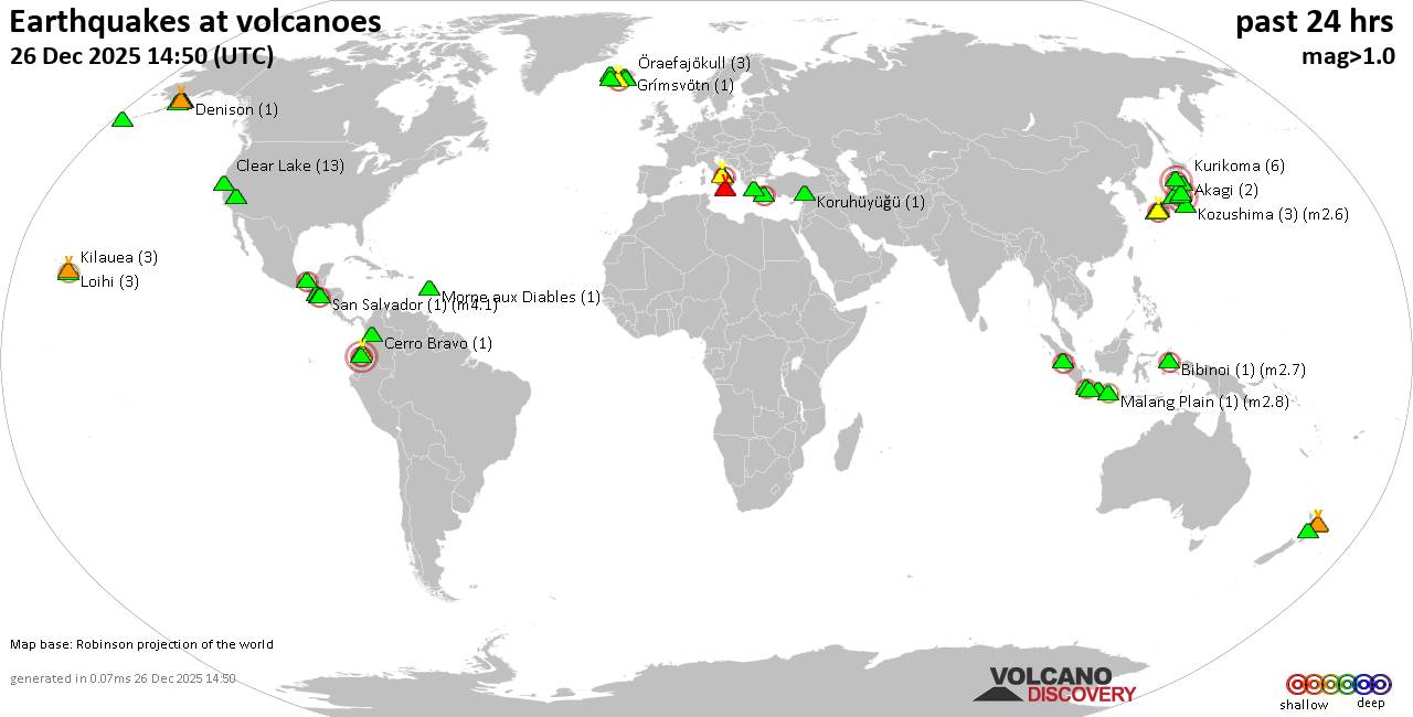 Volcano earthquake report for Friday, 26 Dec 2025 World map showing volcanoes with shallow (less than 50 km) earthquakes within 20 km radius during the past 24 hours on 26 Dec 2025 Number in brackets indicate nr of quakes. Quakes detected near: Akagi (2 quakes between mag 1.1-1.2), Apaneca Range (1 quake mag 2.1), Aso (9 quakes between mag 0.4-2.2), Biliran (1 quake mag 2.0), Brennisteinsfjöll (1 quake mag 1.5), Cerro Bravo (1 quake mag 1.4) Cerro Negro de Mayasquer (1 quake mag 1.3), Clear Lake (10 quakes between mag 0.7-1.3), Coso (3 quakes between mag 1.1-1.7), Cuilapa-Barbarena (2 quakes between mag 2.0-2.0), Denison (1 quake mag 1.6), El Chichón (13 quakes between mag 2.1-3.1), Etna (1 quake mag 1.6), Gede-Pangrango (1 quake mag 2.1), Grímsvötn (1 quake mag 1.4), Haku-san (1 quake mag 1.5), Haruna (1 quake mag 3.0), Imbabura (1 quake mag 3.0), Katla (1 quake mag 2.3), Katmai (1 quake mag 1.4), Kilauea (3 quakes between mag 1.7-2.0), Kolumbo (6 quakes between mag 1.4-2.5), Koruhüyüğü (1 quake mag 1.4), Kozushima (3 quakes between mag 2.0-2.6), Kurikoma (4 quakes between mag 0.6-1.3), Ljósufjöll (2 quakes between mag 0.8-1.2), Loki-Fögrufjöll volcano (1 quake mag 3.0), Malang Plain (1 quake mag 2.8), Martin (1 quake mag 1.8), Megata (1 quake mag 3.0), Nikko-Shirane (1 quake mag 1.6), Novarupta (1 quake mag 1.2), Papandayan (1 quake mag 2.1), San Salvador (1 quake mag 4.1), Snowy Mountain (2 quakes between mag 1.3-1.7), Sousaki (1 quake mag 1.1), Sundoro (1 quake mag 3.0), Talang (1 quake mag 2.0), Tenerife (1 quake mag 3.0), Tenorio (1 quake mag 1.7), Tongariro (1 quake mag 1.6), Tsurumi (15 quakes between mag 0.5-2.0), Unzen (1 quake mag 1.4), Vesuvius (3 quakes between mag 0.8-2.3), Whale Island (1 quake mag 1.8), Wide Bay (6 quakes between mag 0.1-1.0), Öraefajökull (4 quakes between mag 0.6-2.1) (updated 11h50) Note: Earthquakes within 20 km from and at depths less than 50 km under active volcanoes are reported. The list is not complete because many volcanoes are not monitored and/or seismic data in high resolution is not available publicly.