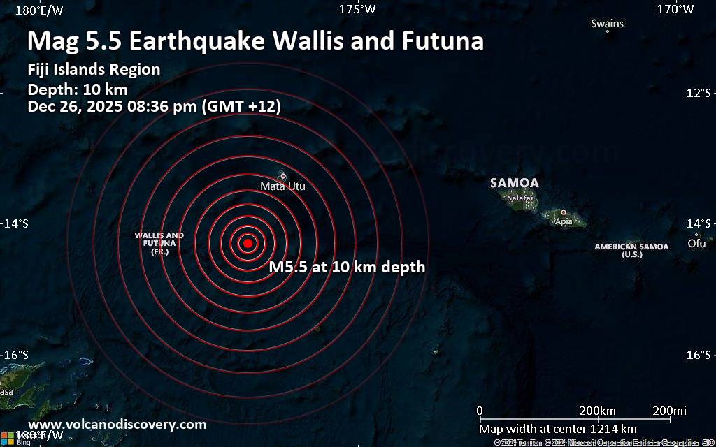 Significant 5.5 quake hits near Mata-Utu, Hahake, Uvea, Wallis & Futuna A shallow magnitude 5.5 earthquake was reported in the evening near Mata-Utu, Hahake, Uvea, Wallis & Futuna. According to the German Research Centre for Geosciences (GFZ), the quake hit on Friday, December 26th, 2025, at 8:36 pm local time at a shallow depth of 10. km. Shallow earthquakes are felt more strongly than deeper ones as they are closer to the surface. The exact magnitude, epicenter, and depth of the quake might be revised within the next few hours or minutes as seismologists review data and refine their calculations, or as other agencies issue their report. A second report was later issued by the citizen-seismograph network of RaspberryShake, which listed it as a magnitude 5.5 earthquake as well. A third agency, France's Réseau National de Surveillance Sismique (RéNaSS), reported the same quake at magnitude 5.0. Based on the preliminary seismic data, the quake should not have caused any significant damage, but was probably felt by many people as light vibration in the area of the epicenter. Weak shaking might have been felt in Kolopopo (pop. 170) located 120 km from the epicenter, Halalo (pop. 560) 121 km away, Utufua (pop. 620) 122 km away, Mua (pop. 3,000) 122 km away, Falaleu (pop. 630) 127 km away, Mata-Utu (pop. 1,200) 129 km away, Liku (pop. 610) 131 km away, and Alele (pop. 630) 132 km away. VolcanoDiscovery will automatically update magnitude and depth if these change and follow up if other significant news about the quake become available. If you’re in the area, please send us your experience through our reporting mechanism, either online or via our mobile app. This will help us provide more first-hand updates to anyone around the globe who wants to know more about this quake.