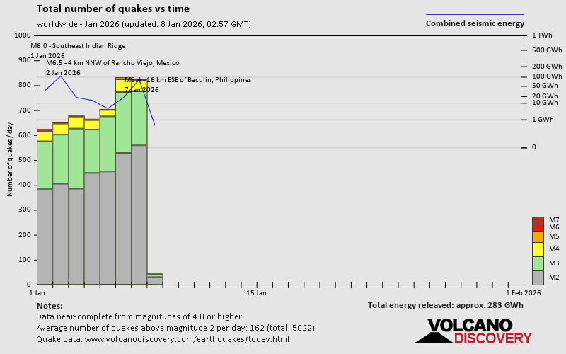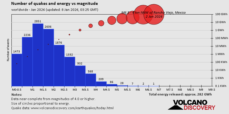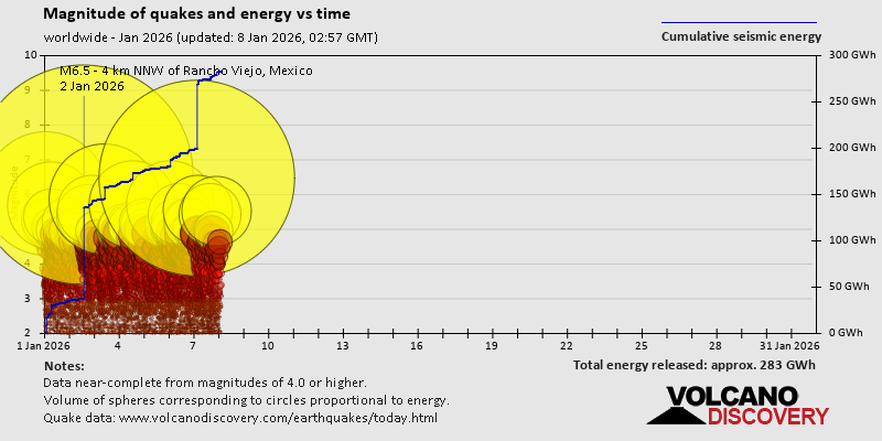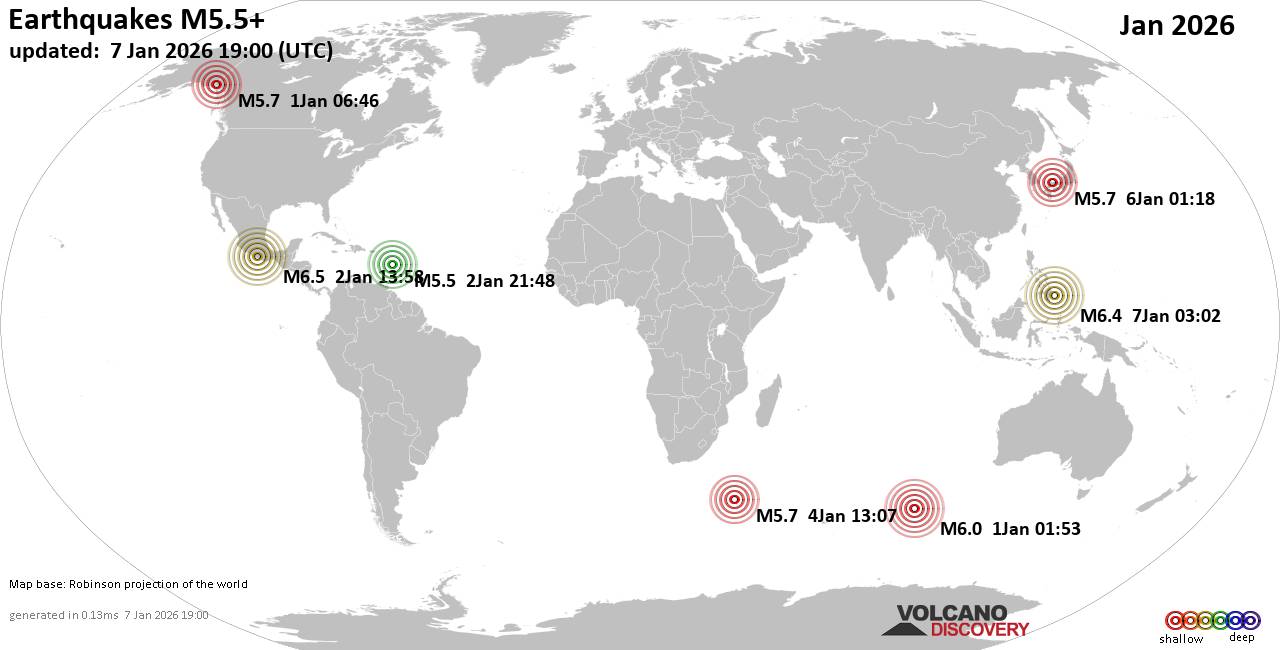 World Earthquake Report for January 2026 Worldwide earthquakes above magnitude 5.5 during January 2026 Summary: 2 quakes 6.0+, 20 quakes 5.0+, 153 quakes 4.0+, 724 quakes 3.0+, 1414 quakes 2.0+ (2313 total)This report is being updated every day.Magnitude 9+: none Magnitude 8+: none Magnitude 7+: none Magnitude 6+: 2 earthquakes Magnitude 5+: 20 earthquakes Magnitude 4+: 153 earthquakes Magnitude 3+: 724 earthquakes Magnitude 2+: 1414 earthquakes No quakes of magnitude 7 or higher List of 10 largest earthquakes in the world during January 2026:Friday, Jan 2, 2026, at 07:58 am (Mexico City time) - Thursday, Jan 1, 2026, at 07:53 am (GMT +6) - Saturday, Jan 3, 2026, at 04:07 pm (GMT +6) - Wednesday, Dec 31, 2025, at 11:46 pm (Whitehorse time) - Sunday, Jan 4, 2026, at 04:07 pm (GMT +3) - Friday, Jan 2, 2026, at 05:48 pm (GMT -4) - Earthquake stats:  https://www.volcanodiscovery.com/view_news/290900/World-Earthquake-Report-for-January-2026.html