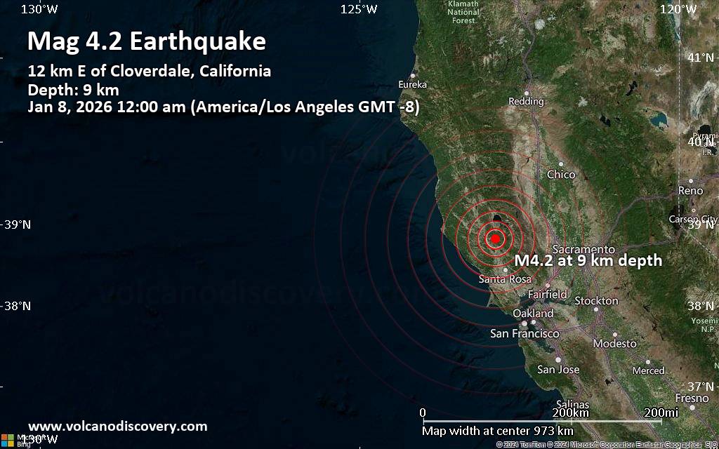 Moderate earthquake of magnitude 4.2 just reported 28 miles northwest of Santa Rosa, California, United States Just 3 minutes ago, a 4.2-magnitude earthquake struck near Santa Rosa, Sonoma County, California, USA. The tremor was recorded after midnight on Thursday, January 8th, 2026, at 12:00 am local time, at a very shallow depth of 5.6 miles below the surface. The event was filed by the United States Geological Survey, the first seismological agency to report it. A second report was later issued by The Incorporated Research Institutions for Seismology (IRIS), which listed it as a magnitude 4.2 earthquake as well. Based on the preliminary seismic data, the quake should not have caused any significant damage, but was probably felt by many people as light vibration in the area of the epicenter. Weak shaking might have been felt in Cloverdale (pop. 8,800) located 8 miles from the epicenter, Clearlake (pop. 15,200) 16 miles away, and Windsor (pop. 27,500) 20 miles away. Other towns or cities near the epicenter where the quake might have been felt as very weak shaking include Santa Rosa (pop. 178,100) located 28 miles from the epicenter, Ukiah (pop. 15,900) 29 miles away, Rohnert Park (pop. 42,400) 35 miles away, Agua Caliente (pop. 27,100) 41 miles away, Petaluma (pop. 60,400) 43 miles away, and Napa (pop. 80,400) 49 miles away.
