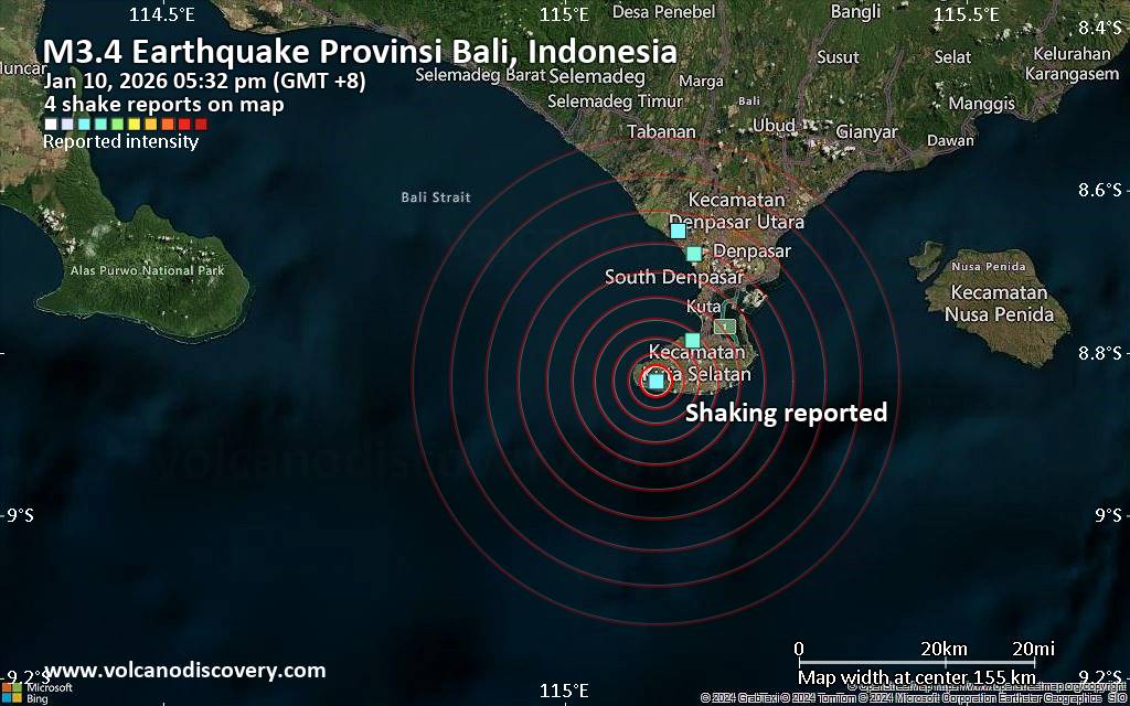 Earthquake data: Date & time: Jan 10, 2026 05:32 pm (GMT +8) local time (10 Jan 2026 09:32 GMT)Magnitude: unspecified Depth: unspecified Epicenter latitude / longitude: 8.83°S / 115.11°E  ( Provinsi Bali, Indonesia) Primary data source: VolcanoDiscoveryhttps://www.volcanodiscovery.com/earthquake/news/291585/Seismic-like-event-possible-earthquake-reported-few-minutes-ago-near-Denpasar-Bali-Indonesia.html