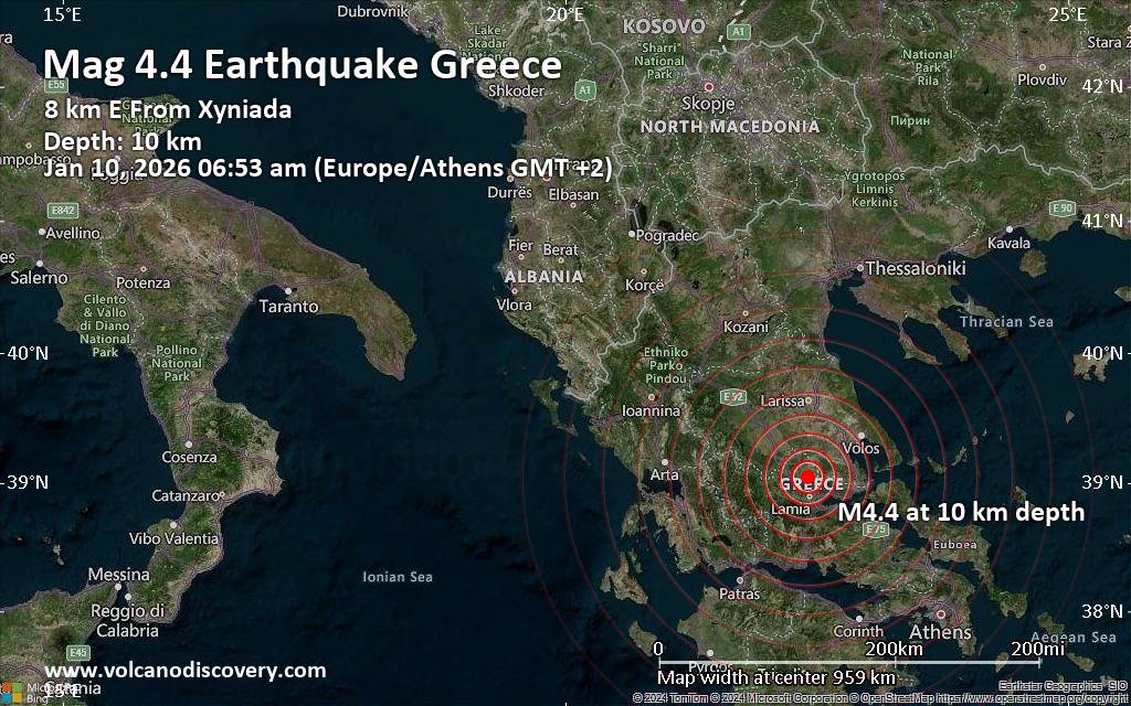 Earthquake data: Date & time: Jan 10, 2026 04:53 am (Universal Time) local time (10 Jan 2026 04:53 GMT)Magnitude: 4.4 Depth: 16.50 km Epicenter latitude / longitude: 39.01°N / 22.38°E  ( Dimos Domokos, Central Greece, Greece) Primary data source: NOAhttps://www.volcanodiscovery.com/earthquake/news/291568/Moderate-tremor-of-magnitude-44-just-reported-16-km-north-of-Lamia-Greece.html