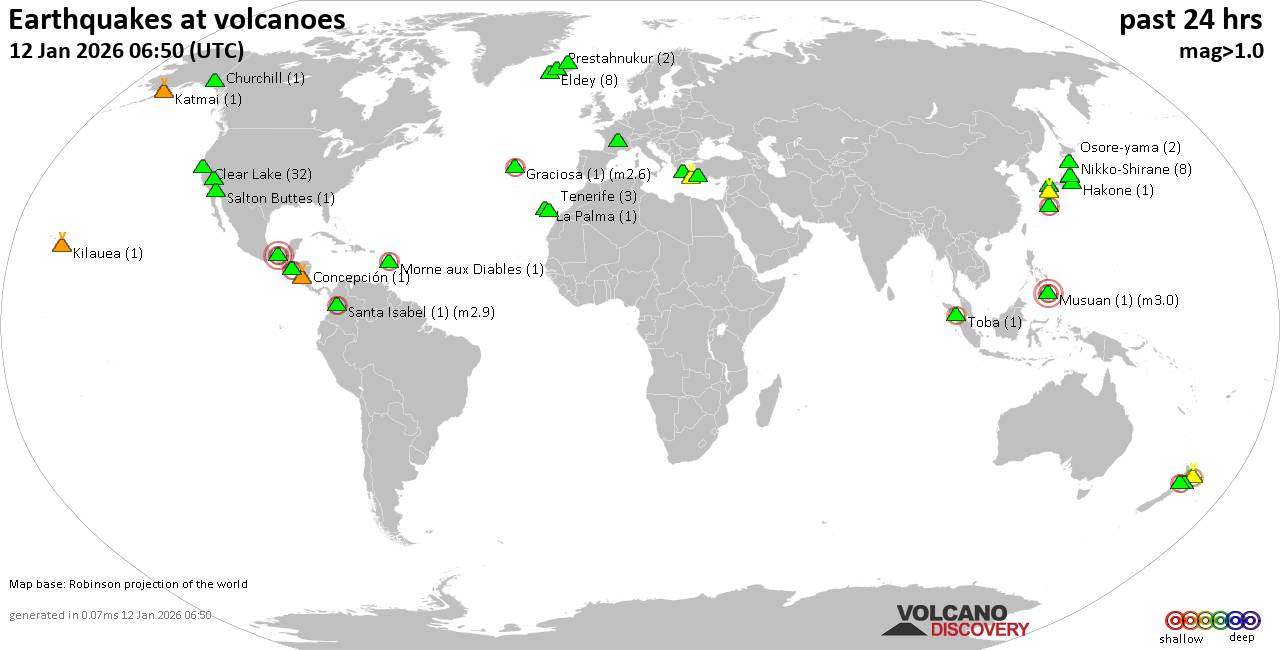 Volcano earthquake report for Monday, 12 Jan 2026 World map showing volcanoes with shallow (less than 50 km) earthquakes within 20 km radius during the past 24 hours on 12 Jan 2026 Number in brackets indicate nr of quakes. Quakes detected near: Abu (1 quake mag 1.0), Akagi (1 quake mag 1.6), Akuseki-jima (1 quake mag 2.9), Aso (9 quakes between mag 0.1-1.1), Bibinoi (1 quake mag 2.5), Chaîne des Puys (1 quake mag 1.9) Churchill (1 quake mag 1.6), Clear Lake (31 quakes between mag 0.2-1.7), Colima (1 quake mag 3.0), Concepción (1 quake mag 1.8), Coso (2 quakes between mag 0.5-1.7), El Chichón (14 quakes between mag 1.9-2.8), Eldey (18 quakes between mag 0.5-1.9), Etna (1 quake mag 1.4), Fagradalsfjall (2 quakes between mag 0.1-1.8), Graciosa (1 quake mag 2.6), Hakkoda (1 quake mag 3.0), Hakone (1 quake mag 1.1), Hrómundartindur (5 quakes between mag 0.2-1.5), Katmai (1 quake mag 1.1), Kilauea (3 quakes between mag 1.7-1.9), La Palma (1 quake mag 1.3), Lipari (1 quake mag 2.4), Maunaloa (1 quake mag 1.7), Morne Plat Pays (1 quake mag 1.4), Morne aux Diables (1 quake mag 2.5), Musuan (1 quake mag 3.0), Nikko-Shirane (3 quakes between mag 0.6-1.2), Osore-yama (2 quakes between mag 0.7-1.5), Prestahnukur (2 quakes between mag 1.1-1.2), Ruapehu (1 quake mag 1.3), Salton Buttes (2 quakes between mag 1.4-1.6), Santa Isabel (1 quake mag 1.9), Santorini (2 quakes between mag 1.7-3.6), Sousaki (4 quakes between mag 1.6-2.0), Svartsengi (2 quakes between mag 0.6-1.0), Taranaki (1 quake mag 2.4), Tenerife (4 quakes between mag 0.8-1.2), Tjörnes Fracture Zone (2 quakes between mag 0.8-1.2), Toba (1 quake mag 2.3), Whale Island (1 quake mag 2.3) (updated 02h50) Note: Earthquakes within 20 km from and at depths less than 50 km under active volcanoes are reported. The list is not complete because many volcanoes are not monitored and/or seismic data in high resolution is not available publicly.
