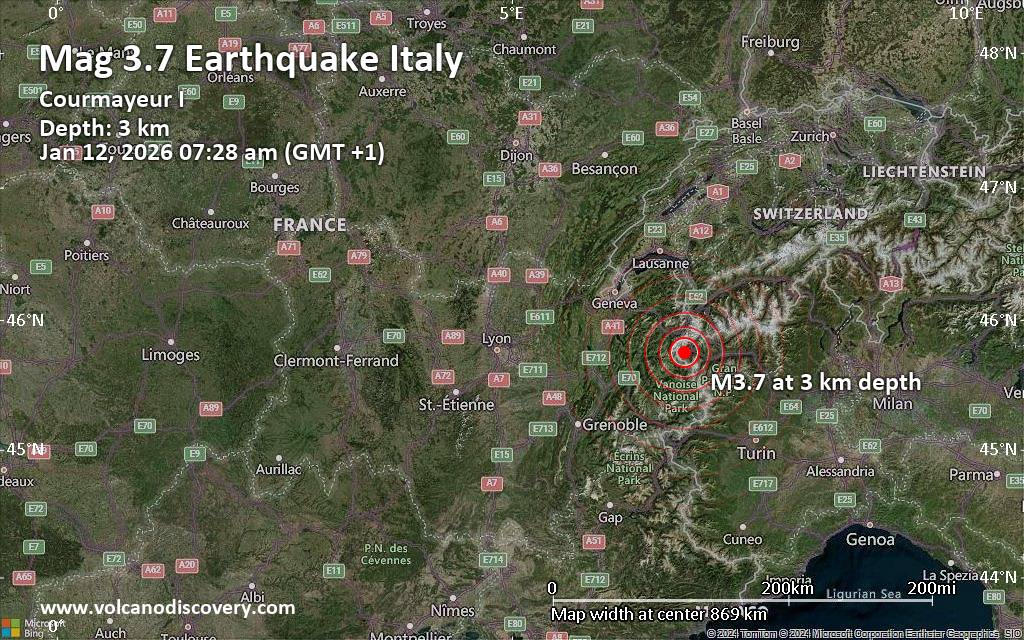 Small 3.7 quake hits near Aosta, Valla d'Aosta, Aosta Valley, Italy An earthquake of magnitude 3.7 occurred only 8 minutes ago 33 km west of Aosta, Italy, the Swiss Seismological Service (SED) reported. The quake hit at a very shallow depth of 3.20 km beneath the epicenter near Aosta, Valla d'Aosta, Aosta Valley, Italy, in the morning on Monday, January 12th, 2026, at 7:28 am local time. The exact magnitude, epicenter, and depth of the quake might be revised within the next few hours or minutes as seismologists review data and refine their calculations, or as other agencies issue their report. Based on the preliminary seismic data, the quake should not have caused any significant damage, but was probably felt by many people as light vibration in the area of the epicenter. Weak shaking might have been felt in Courmayeur (pop. 2,800) located 8 km from the epicenter, and Morgex (pop. 1,700) 12 km away. Other towns or cities near the epicenter where the quake might have been felt as very weak shaking include Sallanches (pop. 16,700) located 29 km from the epicenter, Aosta (pop. 35,300) 33 km away, Albertville (pop. 19,100) 40 km away, Martigny-Ville (pop. 18,300) 42 km away, Cluses (pop. 19,800) 43 km away, and Annecy (pop. 49,200) 62 km away.