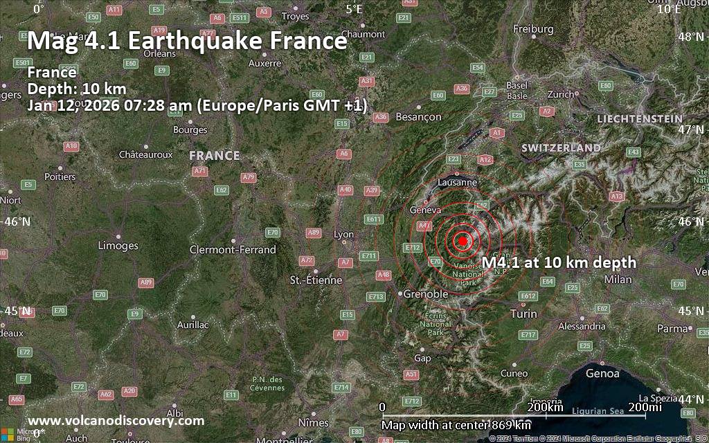 Earthquake data: Date & time: Jan 12, 2026 07:28 am (Paris time) local time (12 Jan 2026 06:28 GMT)Magnitude: 4.1 Depth: 10.00 km Epicenter latitude / longitude: 45.78°N / 6.72°E  ( Valle d'Aosta, Aosta Valley, France) Primary data source: EMSChttps://www.volcanodiscovery.com/earthquake/news/291746/Moderate-tremor-of-magnitude-41-just-reported-19-km-southeast-of-Sallanches-France.html