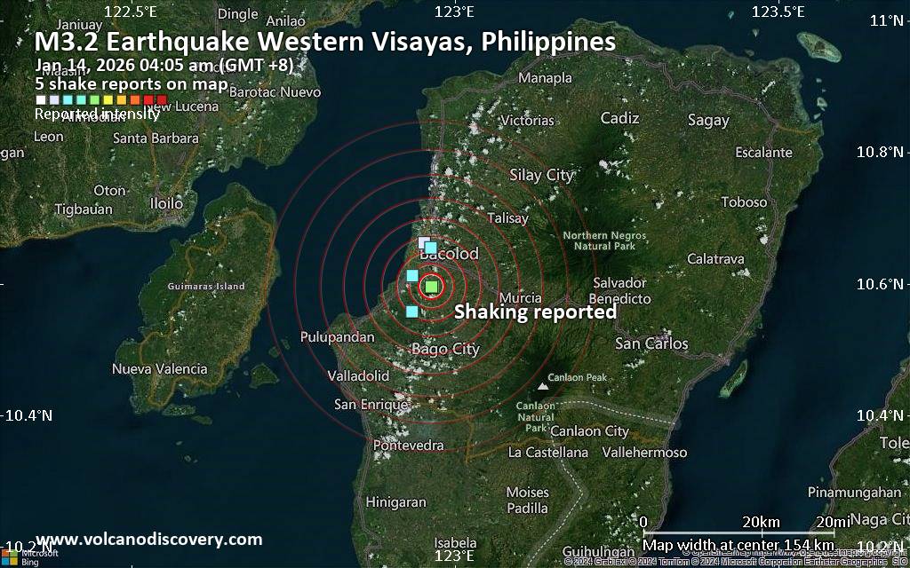 Earthquake data: Date & time: Jan 14, 2026 04:05 am (GMT +8) local time (13 Jan 2026 20:05 GMT)Magnitude: unspecified Depth: unspecified Epicenter latitude / longitude: 10.6°N / 122.96°E  ( Western Visayas, Philippines) Primary data source: VolcanoDiscoveryhttps://www.volcanodiscovery.com/earthquake/news/291865/Seismic-like-event-possible-earthquake-reported-few-minutes-ago-near-Bacolod-City-Western-Visayas-Ph.html