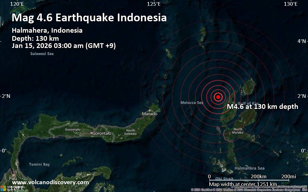 Magnitude 4.6 earthquake strikes near Tobelo, North Halmahera Regency, North Maluku, Indonesia Just 6 minutes ago, a 4.6-magnitude earthquake struck near Tobelo, North Halmahera Regency, North Maluku, Indonesia. The tremor was recorded early morning on Thursday, January 15th, 2026, at 3:00 am local time, at an intermediate depth of 130. km below the surface. The event was filed by Indonesia's Meteorology, Climatology, and Geophysical Agency, the first seismological agency to report it. Towns or cities near the epicenter where the quake might have been felt as very weak shaking include Galela (pop. 8,800) located 51 km from the epicenter, Tobelo (pop. 34,200) 78 km away, and Daruba (pop. 23,600) 105 km away. VolcanoDiscovery will automatically update magnitude and depth if these change and follow up if other significant news about the quake become available. If you’re in the area, please send us your experience through our reporting mechanism, either online or via our mobile app. This will help us provide more first-hand updates to anyone around the globe who wants to know more about this quake.