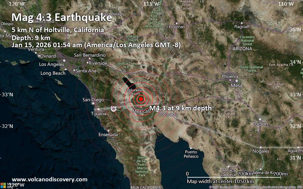 Magnitude 4.3 earthquake strikes near El Centro, Imperial County, California, USA An earthquake of magnitude 4.3 occurred early morning on Thursday, January 15th, 2026, at 1:54 am local time near El Centro, Imperial County, California, USA, as reported by the United States Geological Survey. According to preliminary data, the quake was located at a very shallow depth of 5.6 miles. Shallow earthquakes are felt more strongly than deeper ones as they are closer to the surface. The exact magnitude, epicenter, and depth of the quake might be revised within the next few hours or minutes as seismologists review data and refine their calculations, or as other agencies issue their report. Our monitoring service identified a second report from The Incorporated Research Institutions for Seismology (IRIS) which listed the quake at magnitude 4.3 as well. Based on the preliminary seismic data, the quake was probably felt by many people in the area of the epicenter. It should not have caused significant damage, other than objects falling from shelves, broken windows, etc. In Holtville (pop. 6,400) located 3 miles from the epicenter, the quake should have been felt as light shaking. Weak shaking might have been felt in Imperial (pop. 17,100) located 10 miles from the epicenter, El Centro (pop. 44,000) 11 miles away, Brawley (pop. 25,900) 12 miles away, Calexico (pop. 40,100) 14 miles away, Mexicali (pop. 1,032,700) 17 miles away, and Santa Isabel (pop. 29,300) 19 miles away. Other towns or cities near the epicenter where the quake might have been felt as very weak shaking include San Luis (pop. 31,500) located 44 miles from the epicenter, and Yuma (pop. 95,500) 45 miles away. VolcanoDiscovery will automatically update magnitude and depth if these change and follow up if other significant news about the quake become available. If you’re in the area, please send us your experience through our reporting mechanism, either online or via our mobile app. This will help us provide more first-hand updates to anyone around the globe who wants to know more about this quake.