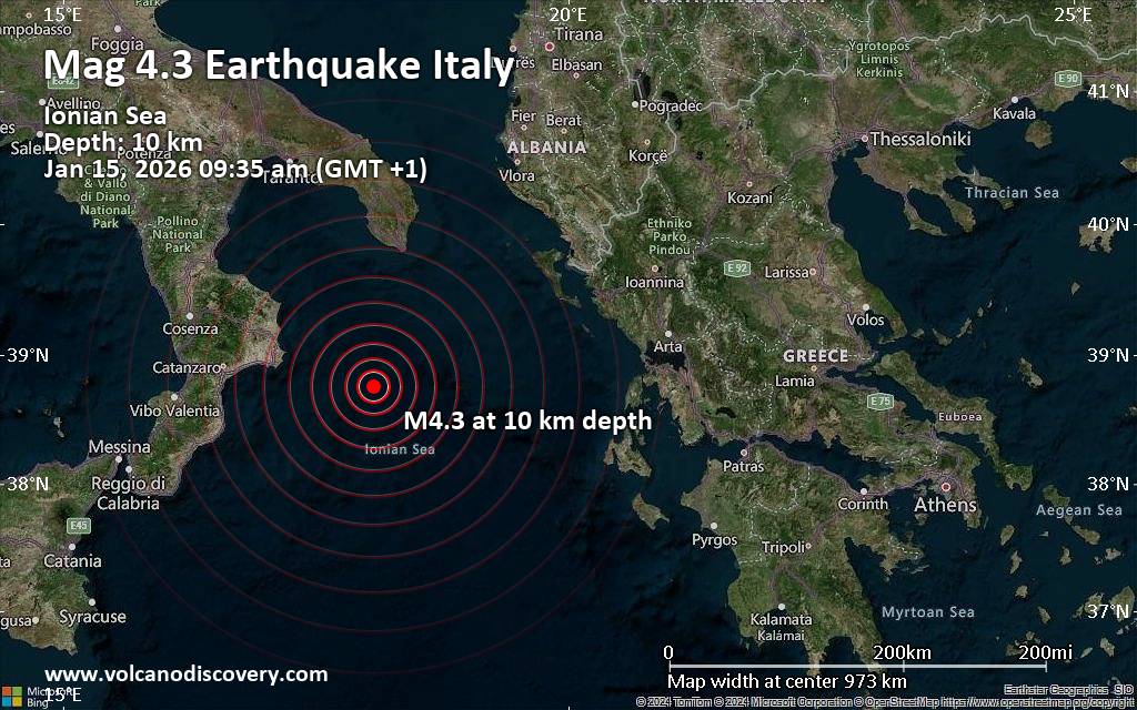 Earthquake data: Date & time: Jan 15, 2026 09:35 am (GMT +1) local time (15 Jan 2026 08:35 GMT)Magnitude: 4.3 Depth: 10.00 km Epicenter latitude / longitude: 38.76°N / 18.07°E  ( Italy) Primary data source: GFZhttps://www.volcanodiscovery.com/earthquake/news/291973/Moderate-magnitude-43-earthquake-89-km-southeast-of-Crotone-Italy.html