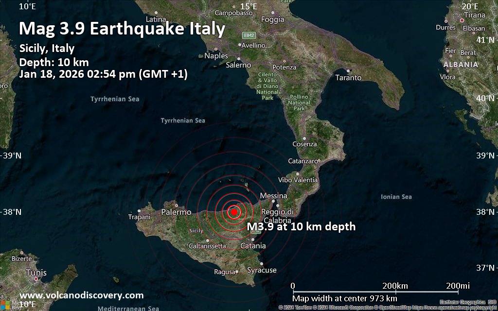 Earthquake data: Date & time: Jan 18, 2026 01:54 pm (Universal Time) local time (18 Jan 2026 13:54 GMT)Magnitude: 4.0 Depth: 5.00 km Epicenter latitude / longitude: 38°N / 14.67°E  ( Province of Messina, Sicily, Italy) Primary data source: EMSChttps://www.volcanodiscovery.com/earthquake/news/292258/Small-magnitude-39-earthquake-28-km-northwest-of-Bronte-Italy.html