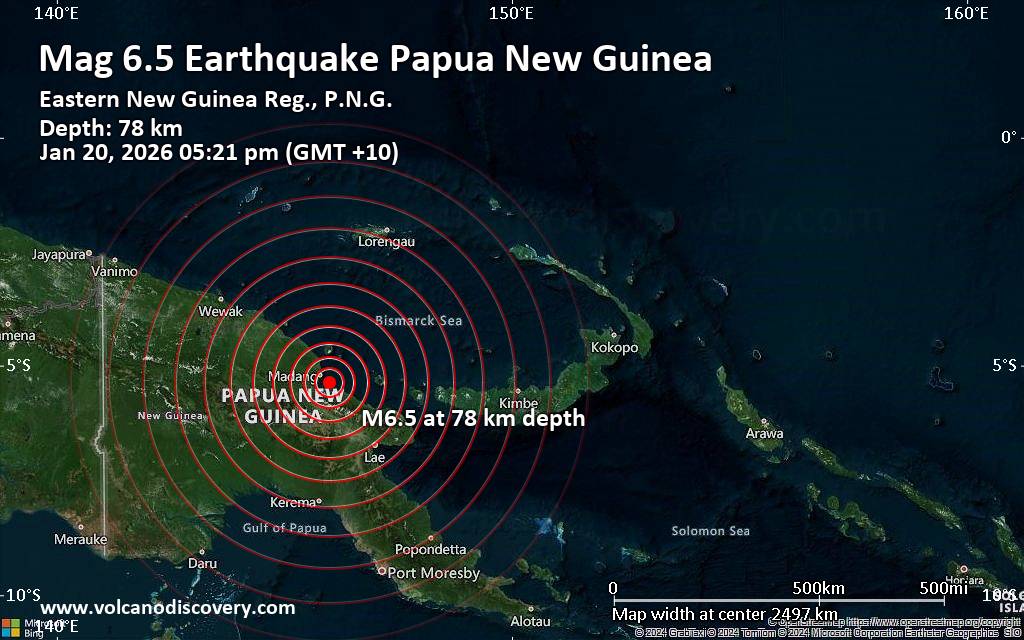 Earthquake data: Date & time: Jan 20, 2026 05:21 pm (Port Moresby time) local time (20 Jan 2026 07:21 GMT)Magnitude: 6.5 Depth: 78.00 km Epicenter latitude / longitude: 5.38°S / 145.98°E  ( Papua New Guinea) Primary data source: EMSChttps://www.volcanodiscovery.com/earthquake/news/292421/Significant-65-quake-hits-near-Madang-Madang-Province-Papua-New-Guinea.html