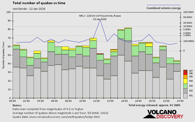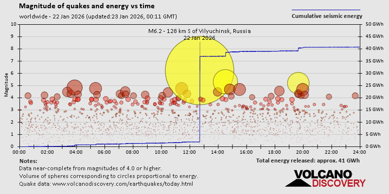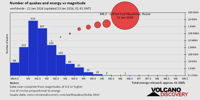 World Earthquake Report for Thursday, 22 January 2026 Worldwide earthquakes above magnitude 3 during the past 24 hours on 23 Jan 2026 Summary: 1 quake 6.0+, 2 quakes 5.0+, 35 quakes 4.0+, 178 quakes 3.0+, 396 quakes 2.0+ (612 total)Magnitude 6+: 1 earthquake Magnitude 5+: 2 earthquakes Magnitude 4+: 35 earthquakes Magnitude 3+: 178 earthquakes Magnitude 2+: 396 earthquakes No quakes of magnitude 7 or higher 10 largest earthquakes in the world (22 Jan 2026)Thursday, Jan 22, 2026, at 11:42 pm (GMT +11) - Thursday, Jan 22, 2026, at 11:31 pm (GMT +9) - Thursday, Jan 22, 2026, at 08:38 am (GMT -11) - Thursday, Jan 22, 2026, at 01:53 pm (GMT +10) - Thursday, Jan 22, 2026, at 08:26 pm (Jayapura time) - Thursday, Jan 22, 2026, at 05:59 pm (GMT -2) - Thursday, Jan 22, 2026, at 08:52 am (Tehran time) - Thursday, Jan 22, 2026, at 08:00 pm (GMT +4:30) - Thursday, Jan 22, 2026, at 07:49 am (Denver time) - Friday, Jan 23, 2026, at 06:18 am (Kamchatka time) - Earthquakes reported feltThursday, Jan 22, 2026, at 07:49 am (Denver time) - Thursday, Jan 22, 2026, at 11:42 pm (GMT +11) - Wednesday, Jan 21, 2026, at 08:22 pm (GMT -8) - Friday, Jan 23, 2026, at 12:34 am (GMT +1) - Thursday, Jan 22, 2026, at 11:31 pm (GMT +9) - Thursday, Jan 22, 2026, at 01:53 pm (GMT +10) - Thursday, Jan 22, 2026, at 05:13 am (GMT -6) - Thursday, Jan 22, 2026, at 08:37 pm (GMT +1) - Thursday, Jan 22, 2026, at 11:22 am (GMT -7) - Thursday, Jan 22, 2026, at 12:09 am (GMT -8) - Thursday, Jan 22, 2026, at 03:53 am (GMT +1) - Friday, Jan 23, 2026, at 01:25 am (GMT +13) - Thursday, Jan 22, 2026, at 06:52 am (GMT -5) - Wednesday, Jan 21, 2026, at 11:28 pm (GMT -8) - Thursday, Jan 22, 2026, at 07:34 pm (GMT +1) - Thursday, Jan 22, 2026, at 03:03 pm (Urumqi time) - Thursday, Jan 22, 2026, at 08:00 pm (GMT +4:30) - Earthquake stats  https://www.volcanodiscovery.com/earthquake/news/292595/World-Earthquake-Report-for-Thursday-22-January-2026.html