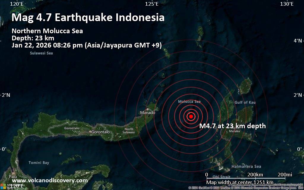 Earthquake data: Date & time: Jan 22, 2026 08:26 pm (Jayapura time) local time (22 Jan 2026 11:26 GMT)Magnitude: 4.7 Depth: 23.00 km Epicenter latitude / longitude: 1.2°N / 126.44°E  (Kota Ternate, North Maluku, Indonesia) Primary data source: BMKGhttps://www.volcanodiscovery.com/earthquake/news/292647/Moderate-magnitude-47-quake-hits-114-km-northwest-of-Ternate-Indonesia-in-the-evening-.html