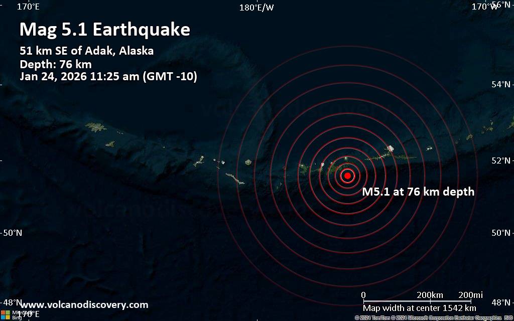 Earthquake data: Date & time: Jan 24, 2026 11:25 am (GMT -10) local time (24 Jan 2026 21:25 GMT)Magnitude: 5.1 Depth: 76.00 km Epicenter latitude / longitude: 51.59°N / 176.04°W  (Aleutians West, Alaska, United States) Primary data source: USGShttps://www.volcanodiscovery.com/earthquake/news/292858/Significant-magnitude-51-quake-hits-32-miles-southeast-of-Adak-Alaska-United-States-in-the-morning-.html