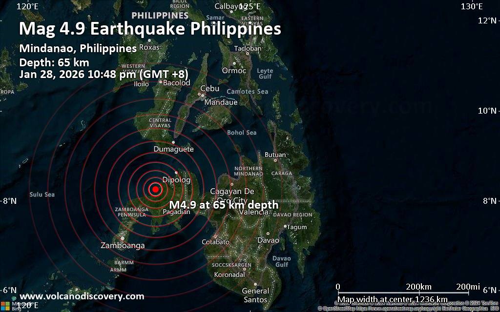 Moderate magnitude 4.9 earthquake 79 km northwest of Pagadian, Philippines Indonesia's Meteorology, Climatology, and Geophysical Agency reported a magnitude 4.9 quake in the Philippines near Pagadian, Zamboanga del Sur, Zamboanga Peninsula, only 11 minutes ago. The earthquake hit late at night on Wednesday, January 28th, 2026, at 10:48 pm local time at a moderately shallow depth of 65. km. The exact magnitude, epicenter, and depth of the quake might be revised within the next few hours or minutes as seismologists review data and refine their calculations, or as other agencies issue their report. Based on the preliminary seismic data, the quake should not have caused any significant damage, but was probably felt by many people as light vibration in the area of the epicenter. Weak shaking might have been felt in Leon Postigo (pop. 3,800) located 13 km from the epicenter, Ipil (pop. 19,200) 61 km away, Dipolog (pop. 93,500) 62 km away, Mahayag (pop. 17,100) 65 km away, Molave (pop. 21,100) 71 km away, Dapitan (pop. 85,200) 75 km away, Pagadian (pop. 206,500) 79 km away, and Muricay (pop. 132,100) 82 km away. VolcanoDiscovery will automatically update magnitude and depth if these change and follow up if other significant news about the quake become available. If you’re in the area, please send us your experience through our reporting mechanism, either online or via our mobile app. This will help us provide more first-hand updates to anyone around the globe who wants to know more about this quake.