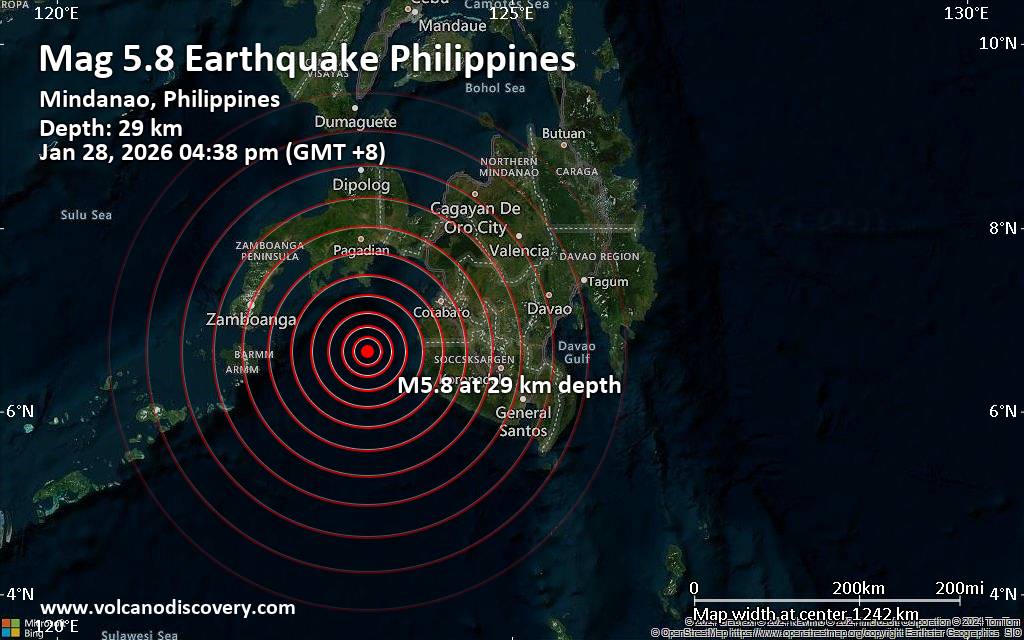 Significant magnitude 5.8 earthquake 72 km west of Kalamansig, Philippines A shallow magnitude 5.8 earthquake was reported in the afternoon near Kalamansig, Sultan Kudarat, Soccsksargen, Philippines. According to Indonesia's Meteorology, Climatology, and Geophysical Agency, the quake hit on Wednesday, January 28th, 2026, at 4:38 pm local time at a shallow depth of 29. km. Shallow earthquakes are felt more strongly than deeper ones as they are closer to the surface. The exact magnitude, epicenter, and depth of the quake might be revised within the next few hours or minutes as seismologists review data and refine their calculations, or as other agencies issue their report. Our monitoring service identified a second report from the German Research Centre for Geosciences (GFZ) which listed the quake at magnitude 5.6. A third agency, the citizen-seismograph network of RaspberryShake, reported the same quake at magnitude 5.7. Based on the preliminary seismic data, the quake was probably felt by many people in the area of the epicenter. It should not have caused significant damage, other than objects falling from shelves, broken windows, etc. In Kalamansig (pop. 12,800) located 72 km from the epicenter, and Dinaig (pop. 116,800) 105 km away, the quake should have been felt as light shaking. Weak shaking might have been felt in Cotabato (pop. 383,400) located 112 km from the epicenter, Malingao (pop. 1,122,000) 130 km away, Isulan (pop. 101,500) 132 km away, Midsayap (pop. 117,400) 137 km away, and Tacurong (pop. 116,900) 140 km away. VolcanoDiscovery will automatically update magnitude and depth if these change and follow up if other significant news about the quake become available. If you’re in the area, please send us your experience through our reporting mechanism, either online or via our mobile app. This will help us provide more first-hand updates to anyone around the globe who wants to know more about this quake.