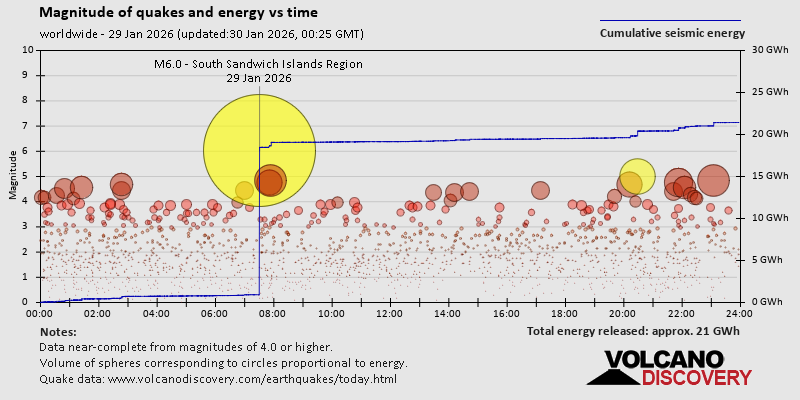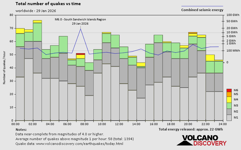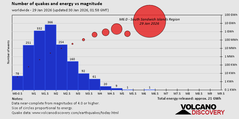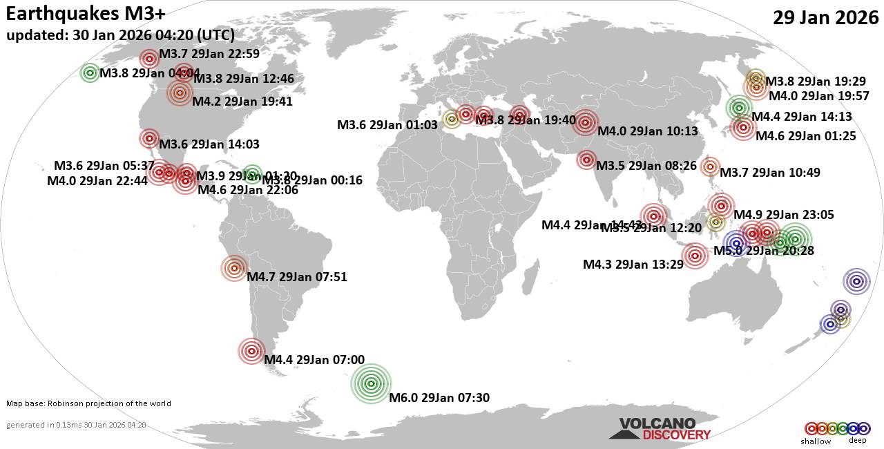 World Earthquake Report for Thursday, 29 January 2026 Worldwide earthquakes above magnitude 3 during the past 24 hours on 30 Jan 2026 Summary: 1 quake 6.0+, 1 quake 5.0+, 30 quakes 4.0+, 185 quakes 3.0+, 429 quakes 2.0+ (646 total)Magnitude 6+: 1 earthquake Magnitude 5+: 1 earthquake Magnitude 4+: 30 earthquakes Magnitude 3+: 185 earthquakes Magnitude 2+: 429 earthquakes No quakes of magnitude 7 or higher 10 largest earthquakes in the world (29 Jan 2026)Thursday, Jan 29, 2026, at 05:30 am (GMT -2) - Friday, Jan 30, 2026, at 07:28 am (GMT +11) - Friday, Jan 30, 2026, at 07:05 am (GMT +8) - Thursday, Jan 29, 2026, at 05:54 pm (GMT +10) - Thursday, Jan 29, 2026, at 02:51 am (GMT -5) - Thursday, Jan 29, 2026, at 08:13 am (GMT -12) - Friday, Jan 30, 2026, at 06:52 am (GMT +9) - Thursday, Jan 29, 2026, at 10:25 am (GMT +9) - Thursday, Jan 29, 2026, at 11:47 am (GMT +9) - Thursday, Jan 29, 2026, at 04:06 pm (GMT -6) - Earthquakes reported feltThursday, Jan 29, 2026, at 12:41 pm (GMT -7) - Thursday, Jan 29, 2026, at 09:06 pm (Kolkata time) - Thursday, Jan 29, 2026, at 09:40 pm (GMT +2) - Thursday, Jan 29, 2026, at 11:47 am (GMT +9) - Thursday, Jan 29, 2026, at 04:06 pm (GMT -6) - Thursday, Jan 29, 2026, at 05:51 pm (GMT -6) - Wednesday, Jan 28, 2026, at 11:50 pm (GMT -3) - Thursday, Jan 29, 2026, at 10:06 pm (Kolkata time) - Thursday, Jan 29, 2026, at 10:25 am (GMT +9) - Friday, Jan 30, 2026, at 07:28 am (GMT +11) - Thursday, Jan 29, 2026, at 11:47 am (GMT +9) - Thursday, Jan 29, 2026, at 08:03 am (GMT -6) - Thursday, Jan 29, 2026, at 12:58 pm (GMT -10) - Friday, Jan 30, 2026, at 07:05 am (GMT +8) - Thursday, Jan 29, 2026, at 09:49 pm (GMT +3) - Earthquake stats  https://www.volcanodiscovery.com/earthquake/news/293285/World-Earthquake-Report-for-Thursday-29-January-2026.html