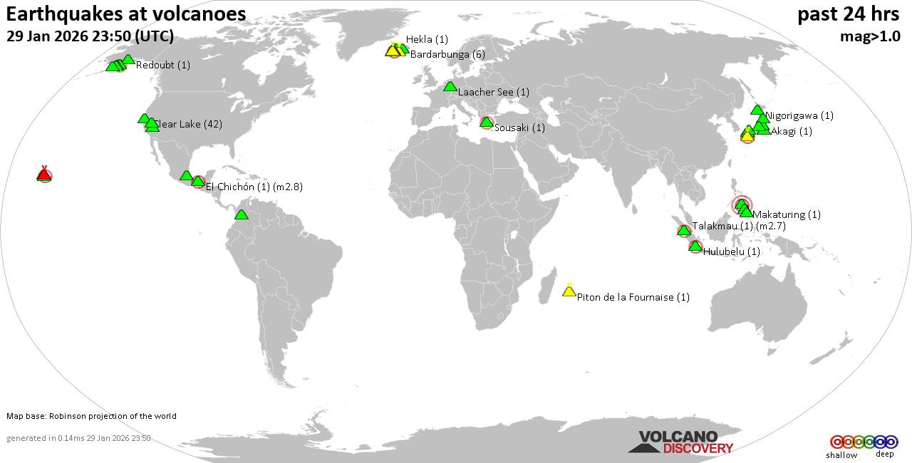 Volcano earthquake report for Thursday, 29 Jan 2026 World map showing volcanoes with shallow (less than 50 km) earthquakes within 20 km radius during the past 24 hours on 29 Jan 2026 Number in brackets indicate nr of quakes. Quakes detected near: Abu (4 quakes between mag 0.7-1.3), Akagi (1 quake mag 1.4), Aso (3 quakes between mag 0.5-2.2), Bardarbunga (6 quakes between mag 0.6-1.2), Brennisteinsfjöll (3 quakes between mag 0.5-2.0), Clear Lake (42 quakes between mag 0.2-1.7) Coso (3 quakes between mag 0.9-1.5), Cuernos de Negros (1 quake mag 3.0), El Chichón (1 quake mag 2.8), Eldey (20 quakes between mag 0.9-2.9), Hakone (1 quake mag 1.0), Hekla (1 quake mag 1.3), Hiuchi (2 quakes between mag 1.3-1.5), Hrómundartindur (22 quakes between mag 0.2-1.8), Hulubelu (1 quake mag 2.2), Kaguyak (1 quake mag 2.2), Katla (6 quakes between mag 0.4-2.5), Katmai (2 quakes between mag 1.0-1.2), Kilauea (3 quakes between mag 1.7-2.3), Krísuvík (1 quake mag 1.3), Kurikoma (2 quakes between mag 0.4-1.0), La Malinche (1 quake mag 3.0), Laacher See (1 quake mag 1.2), Ljósufjöll (2 quakes between mag 0.7-1.0), Loihi (2 quakes between mag 1.8-1.9), Long Valley (1 quake mag 3.0), Makaturing (1 quake mag 1.3), Martin (1 quake mag 1.1), Matutum (1 quake mag 1.9), Maunaloa (1 quake mag 3.3), Nigorigawa (1 quake mag 1.3), Piton de la Fournaise (1 quake mag 1.0), Prestahnukur (4 quakes between mag 1.0-1.8), Redoubt (1 quake mag 1.2), San Diego (1 quake mag 1.6), Sanbe (2 quakes between mag 0.9-1.1), Sousaki (1 quake mag 2.0), Svartsengi (1 quake mag 1.4), Talakmau (1 quake mag 2.7), Ugashik-Peulik (1 quake mag 1.4), Washiba-Kumonotaira (8 quakes between mag 0.3-1.3) (updated 23h50) Note: Earthquakes within 20 km from and at depths less than 50 km under active volcanoes are reported. The list is not complete because many volcanoes are not monitored and/or seismic data in high resolution is not available publicly.