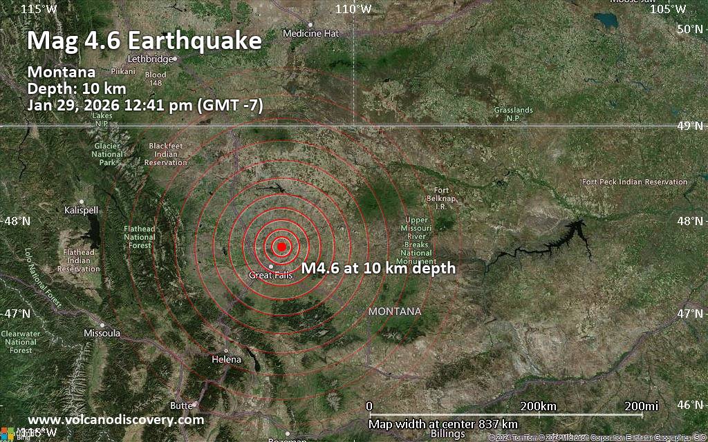 Moderate magnitude 4.6 quake hits 17 miles northeast of Great Falls, Montana, United States around noon An earthquake of magnitude 4.6 occurred only 7 minutes ago 17 miles northeast of Great Falls, Montana, United States, the German Research Centre for Geosciences (GFZ) reported. The quake hit at a shallow depth of 6.2 miles beneath the epicenter near Great Falls, Cascade County, Montana, USA, around noon on Thursday, January 29th, 2026, at 12:41 pm local time. The exact magnitude, epicenter, and depth of the quake might be revised within the next few hours or minutes as seismologists review data and refine their calculations, or as other agencies issue their report. Based on the preliminary seismic data, the quake was probably felt by many people in the area of the epicenter. It should not have caused significant damage, other than objects falling from shelves, broken windows, etc. In Sidney (pop. 58) located 10 miles from the epicenter, the quake should have been felt as light shaking. Weak shaking might have been felt in Black Eagle (pop. 900) located 15 miles from the epicenter, Malmstrom Air Force Base (pop. 3,500) 15 miles away, Great Falls (pop. 59,600) 17 miles away, Sun Prairie (pop. 1,600) 20 miles away, and Fort Benton (pop. 1,500) 23 miles away. Other towns or cities near the epicenter where the quake might have been felt as very weak shaking include Conrad (pop. 2,600) located 48 miles from the epicenter, and Choteau (pop. 1,700) 49 miles away. VolcanoDiscovery will automatically update magnitude and depth if these change and follow up if other significant news about the quake become available. If you’re in the area, please send us your experience through our reporting mechanism, either online or via our mobile app. This will help us provide more first-hand updates to anyone around the globe who wants to know more about this quake.