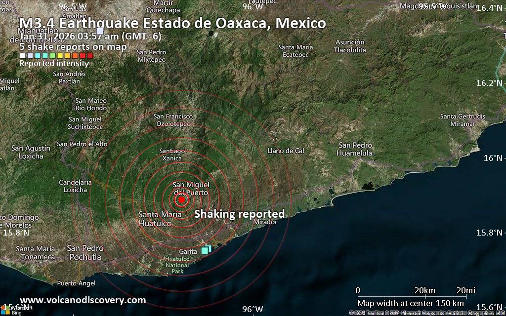 Earthquake data: Date & time: Jan 31, 2026 03:57 am (GMT -6) local time (31 Jan 2026 09:57 GMT)Magnitude: unspecified Depth: unspecified Epicenter latitude / longitude: 15.89°N / 96.2°W  (Santa María Huatulco, Mexico) Primary data source: VolcanoDiscoveryhttps://www.volcanodiscovery.com/earthquake/news/293500/Seismic-like-event-possible-earthquake-reported-about-10-minutes-ago-near-Crucecita-Oaxaca-Mexico.html