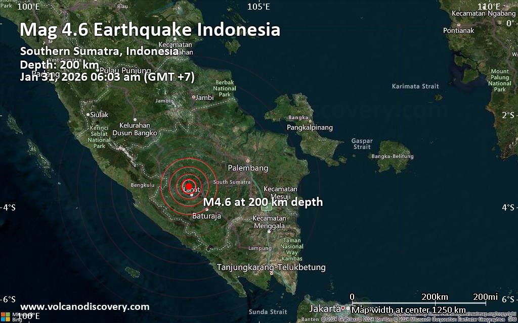 Magnitude 4.6 earthquake strikes near Lahat, Lahat Regency, Sumatera Selatan, Indonesia An earthquake of magnitude 4.6 occurred only 5 minutes ago 28 km northwest of Lahat, Indonesia, Indonesia's Meteorology, Climatology, and Geophysical Agency reported. The quake hit at an intermediate to considerable depth of 200. km beneath the epicenter near Lahat, Lahat Regency, Sumatera Selatan, Indonesia, early morning on Saturday, January 31st, 2026, at 6:03 am local time. The exact magnitude, epicenter, and depth of the quake might be revised within the next few hours or minutes as seismologists review data and refine their calculations, or as other agencies issue their report. A second report was later issued by the citizen-seismograph network of RaspberryShake, which listed it as a magnitude 4.8 earthquake. Towns or cities near the epicenter where the quake might have been felt as very weak shaking include Lahat (pop. 65,900) located 28 km from the epicenter, Tanjungagung (pop. 53,100) 57 km away, Pagar Alam (pop. 70,400) 60 km away, Lubuklinggau (pop. 234,200) 74 km away, and Prabumulih (pop. 103,500) 84 km away. In Baturaja (pop. 134,800, 101 km away), the quake was probably not felt. VolcanoDiscovery will automatically update magnitude and depth if these change and follow up if other significant news about the quake become available. If you’re in the area, please send us your experience through our reporting mechanism, either online or via our mobile app. This will help us provide more first-hand updates to anyone around the globe who wants to know more about this quake.