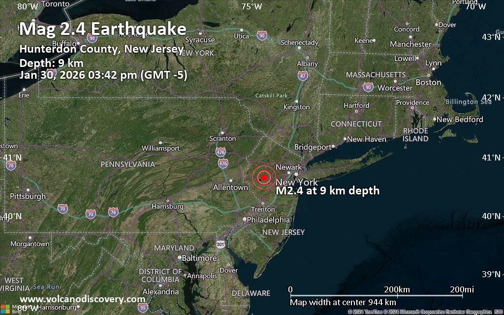 Earthquake data: Date & time: Jan 30, 2026 03:42 pm (GMT -5) local time (30 Jan 2026 20:42 GMT)Magnitude: 2.4 Depth: 8.89 km Epicenter latitude / longitude: 40.67°N / 74.73°W  ( Hunterdon County, New Jersey, United States) Primary data source: USGShttps://www.volcanodiscovery.com/earthquake/news/293453/Magnitude-24-earthquake-strikes-near-Bridgewater-Somerset-County-New-Jersey-USA.html