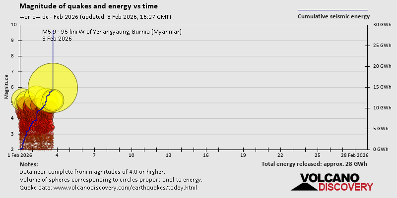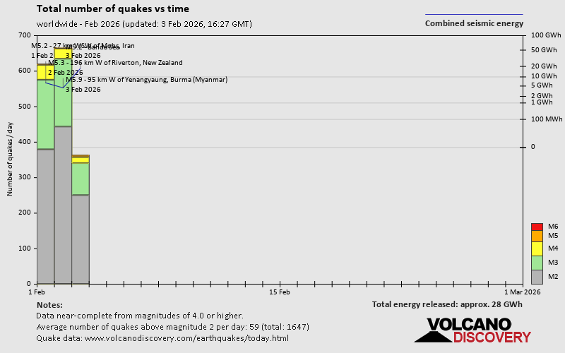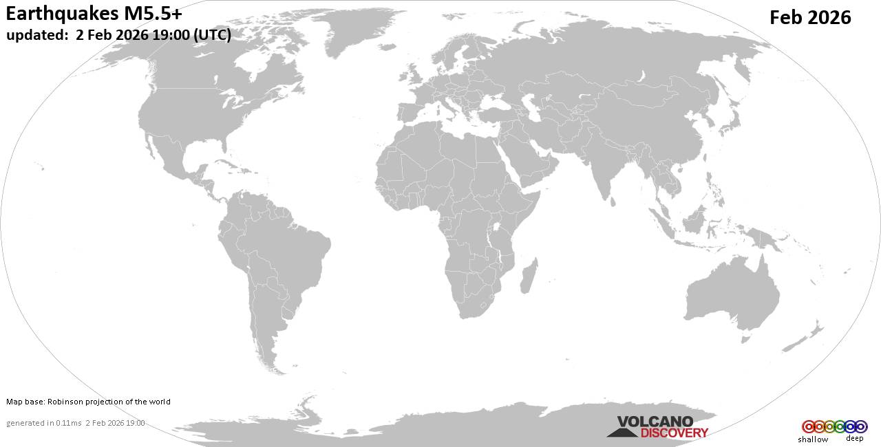 World Earthquake Report for February 2026 Worldwide earthquakes above magnitude 5.5 during February 2026 Summary: 4 quakes 5.0+, 62 quakes 4.0+, 303 quakes 3.0+, 718 quakes 2.0+ (1087 total)This report is being updated every day.Magnitude 9+: none Magnitude 8+: none Magnitude 7+: none Magnitude 6+: none Magnitude 5+: 4 earthquakes Magnitude 4+: 62 earthquakes Magnitude 3+: 303 earthquakes Magnitude 2+: 718 earthquakes No quakes of magnitude 6 or higher List of 10 largest earthquakes in the world during February 2026:Earthquake stats:  https://www.volcanodiscovery.com/view_news/293689/World-Earthquake-Report-for-February-2026.html
