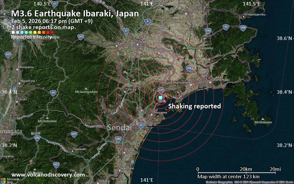 Earthquake data: Date & time: Feb 5, 2026 06:17 pm (GMT +9) local time (5 Feb 2026 09:17 GMT)Magnitude: unspecified Depth: unspecified Epicenter latitude / longitude: 38.38°N / 141.06°E  ( Ibaraki, Japan) Primary data source: VolcanoDiscoveryhttps://www.volcanodiscovery.com/earthquake/news/293951/Seismic-like-event-possible-earthquake-reported-few-minutes-ago-near-Hitachi-Ibaraki-Japan.html
