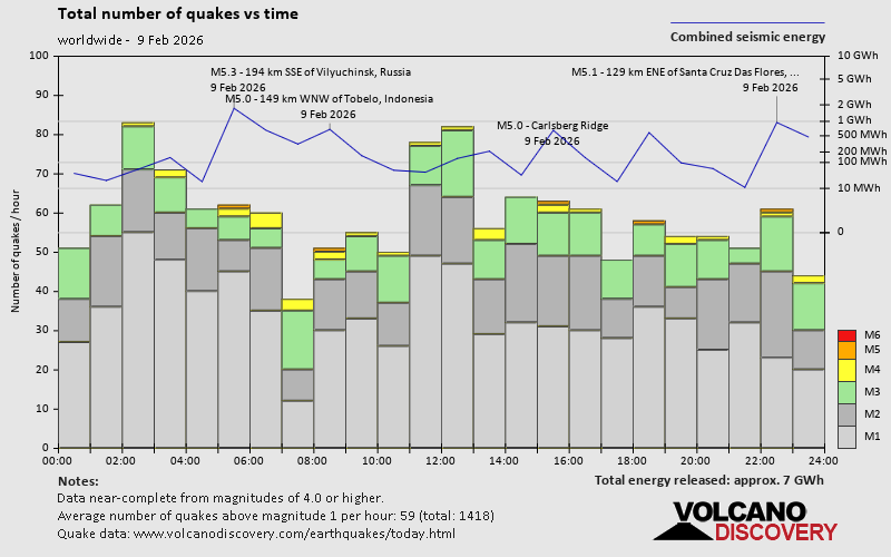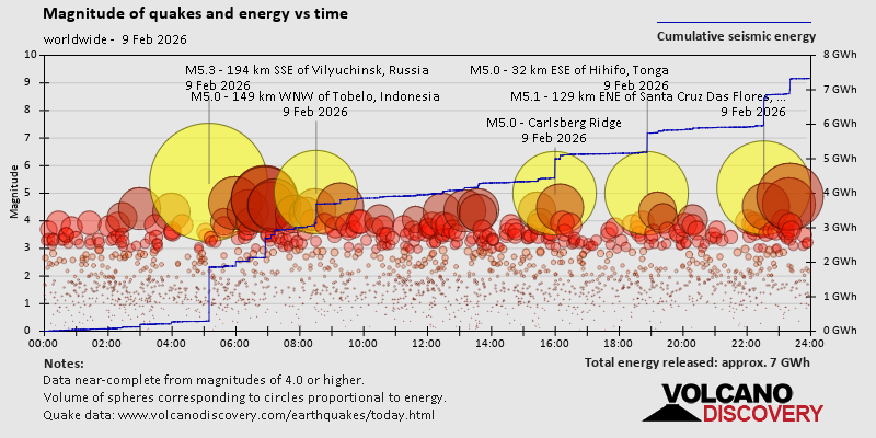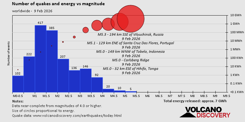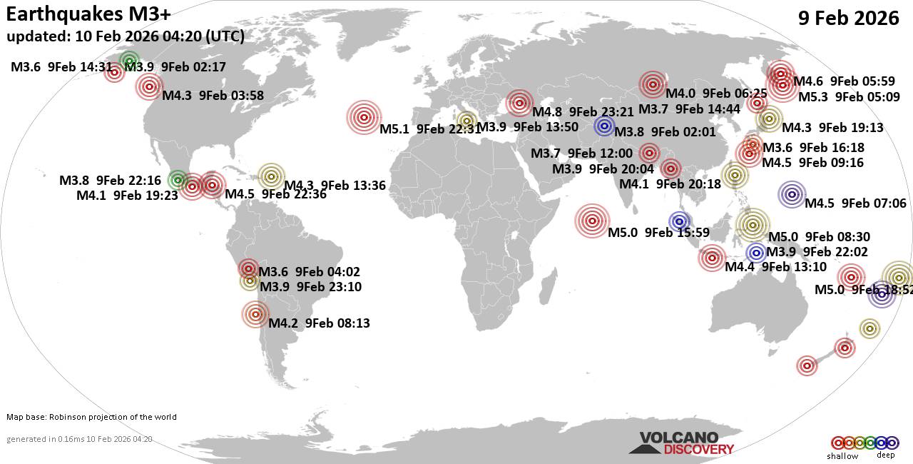 World Earthquake Report for Monday, 9 February 2026 Worldwide earthquakes above magnitude 3 during the past 24 hours on 10 Feb 2026 Summary: 5 quakes 5.0+, 29 quakes 4.0+, 186 quakes 3.0+, 315 quakes 2.0+ (535 total)Magnitude 5+: 5 earthquakes Magnitude 4+: 29 earthquakes Magnitude 3+: 186 earthquakes Magnitude 2+: 315 earthquakes No quakes of magnitude 6 or higher 10 largest earthquakes in the world (9 Feb 2026)Monday, Feb 9, 2026, at 04:09 pm (GMT +11) - Monday, Feb 9, 2026, at 09:31 pm (GMT -1) - Tuesday, Feb 10, 2026, at 07:52 am (GMT +13) - Monday, Feb 9, 2026, at 07:59 pm (GMT +4) - Monday, Feb 9, 2026, at 05:30 pm (GMT +9) - Tuesday, Feb 10, 2026, at 02:21 am (Moscow time) - Monday, Feb 9, 2026, at 06:55 pm (Kamchatka time) - Monday, Feb 9, 2026, at 05:55 pm (GMT +11) - Monday, Feb 9, 2026, at 11:20 am (GMT -12) - Monday, Feb 9, 2026, at 07:12 am (GMT +0) - Earthquakes reported feltTuesday, Feb 10, 2026, at 02:21 am (Moscow time) - Monday, Feb 9, 2026, at 05:30 pm (Kolkata time) - Monday, Feb 9, 2026, at 01:40 pm (GMT +1) - Monday, Feb 9, 2026, at 09:08 am (GMT +2) - Monday, Feb 9, 2026, at 04:36 pm (GMT -6) - Tuesday, Feb 10, 2026, at 04:25 am (GMT +5:30) - Tuesday, Feb 10, 2026, at 02:32 am (GMT +5:30) - Monday, Feb 9, 2026, at 11:32 am (GMT -4) - Monday, Feb 9, 2026, at 08:50 am (GMT +1) - Monday, Feb 9, 2026, at 08:10 pm (GMT +7) - Monday, Feb 9, 2026, at 07:03 am (GMT +2) - Tuesday, Feb 10, 2026, at 12:25 am (GMT +1) - Monday, Feb 9, 2026, at 09:27 pm (GMT +9) - Monday, Feb 9, 2026, at 07:12 am (GMT +0) - Tuesday, Feb 10, 2026, at 02:34 am (GMT +6:30) - Monday, Feb 9, 2026, at 01:35 am (GMT -6) - Sunday, Feb 8, 2026, at 08:26 pm (GMT -6) - Sunday, Feb 8, 2026, at 06:58 pm (GMT -9) - Monday, Feb 9, 2026, at 02:05 am (GMT -3) - Sunday, Feb 8, 2026, at 11:11 pm (GMT -5) - Monday, Feb 9, 2026, at 03:10 am (GMT -5) - Sunday, Feb 8, 2026, at 11:02 pm (GMT -5) - Earthquake stats  https://www.volcanodiscovery.com/earthquake/news/294351/World-Earthquake-Report-for-Monday-9-February-2026.html
