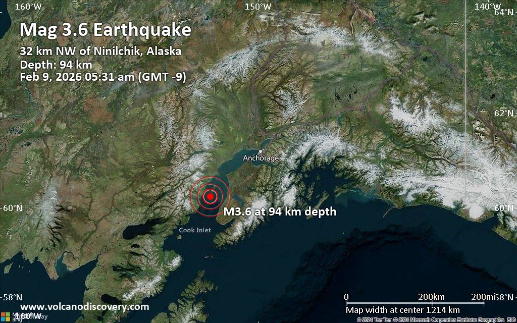 Small magnitude 3.6 earthquake 30 miles southwest of Kalifornsky, Alaska, United States An earthquake of magnitude 3.6 occurred early morning on Monday, February 9th, 2026, at 5:31 am local time near Kalifornsky, Kenai Peninsula, Alaska, USA, as reported by the United States Geological Survey. According to preliminary data, the quake was located at an intermediate depth of 58 miles. The exact magnitude, epicenter, and depth of the quake might be revised within the next few hours or minutes as seismologists review data and refine their calculations, or as other agencies issue their report. Our monitoring service identified a second report from The Incorporated Research Institutions for Seismology (IRIS) which listed the quake at magnitude 3.6 as well. A third agency, the European-Mediterranean Seismological Centre (EMSC), reported the same quake at magnitude 3.6. According to preliminary calculations, we do not expect that the quake was felt by many people and did not cause any damage. In Ninilchik (pop. 880, 20 miles away), Cohoe (pop. 1,400, 29 miles away), Kalifornsky (pop. 7,900, 30 miles away), Anchor Point (pop. 1,900, 34 miles away), Kenai (pop. 7,700, 36 miles away), Soldotna (pop. 4,500, 40 miles away), Ridgeway (pop. 2,000, 40 miles away), and Nikiski (pop. 4,500, 41 miles away), the quake was probably not felt.
