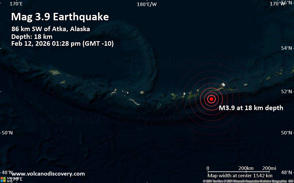 Earthquake data: Date & time: Feb 12, 2026 01:28 pm (GMT -10) local time (12 Feb 2026 23:28 GMT)Magnitude: 3.9 Depth: 18.45 km Epicenter latitude / longitude: 51.64°N / 175.07°W  ( Alaska, United States) Primary data source: USGShttps://www.volcanodiscovery.com/earthquake/news/294719/Small-magnitude-39-quake-hits-54-miles-southwest-of-Atka-Alaska-United-States-around-noon-.html